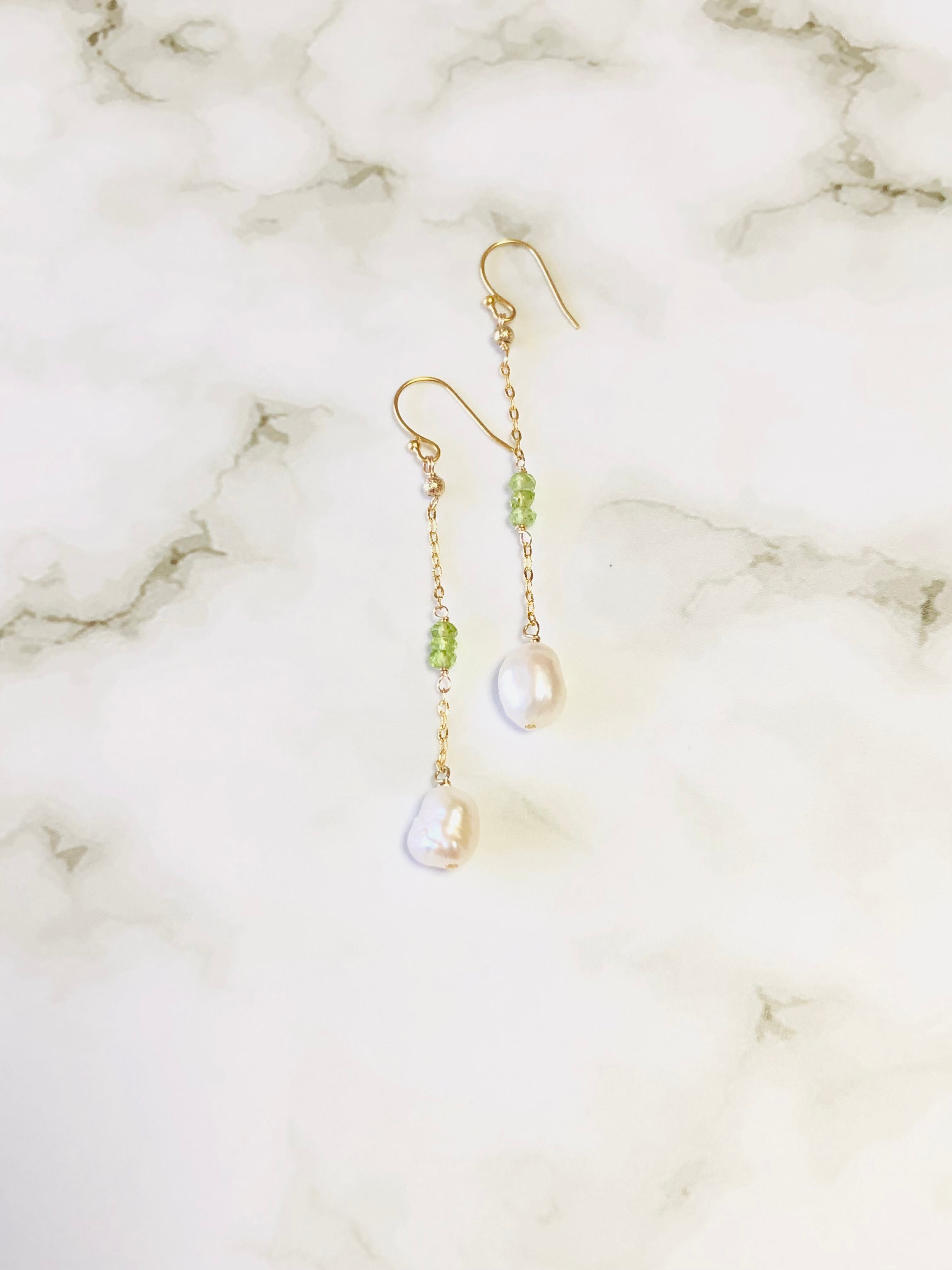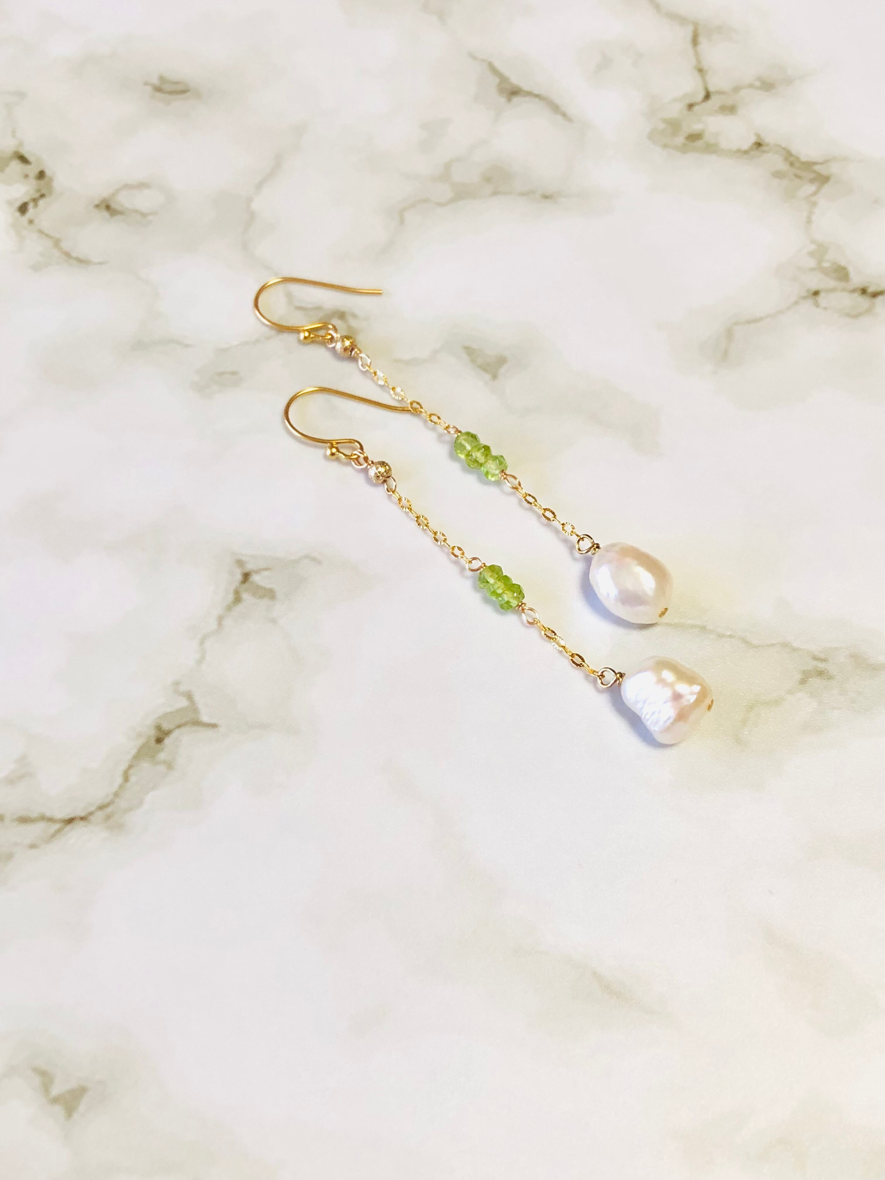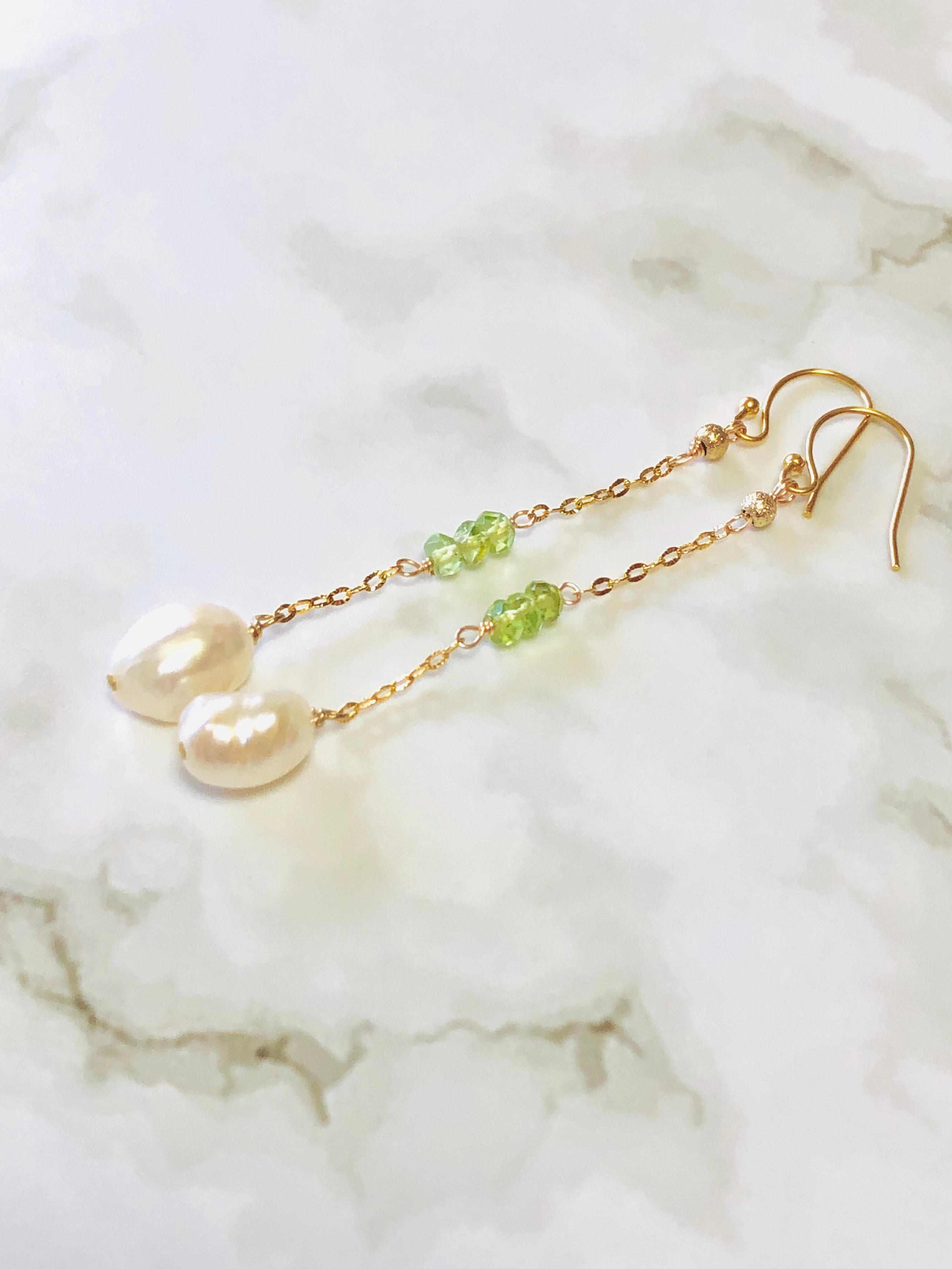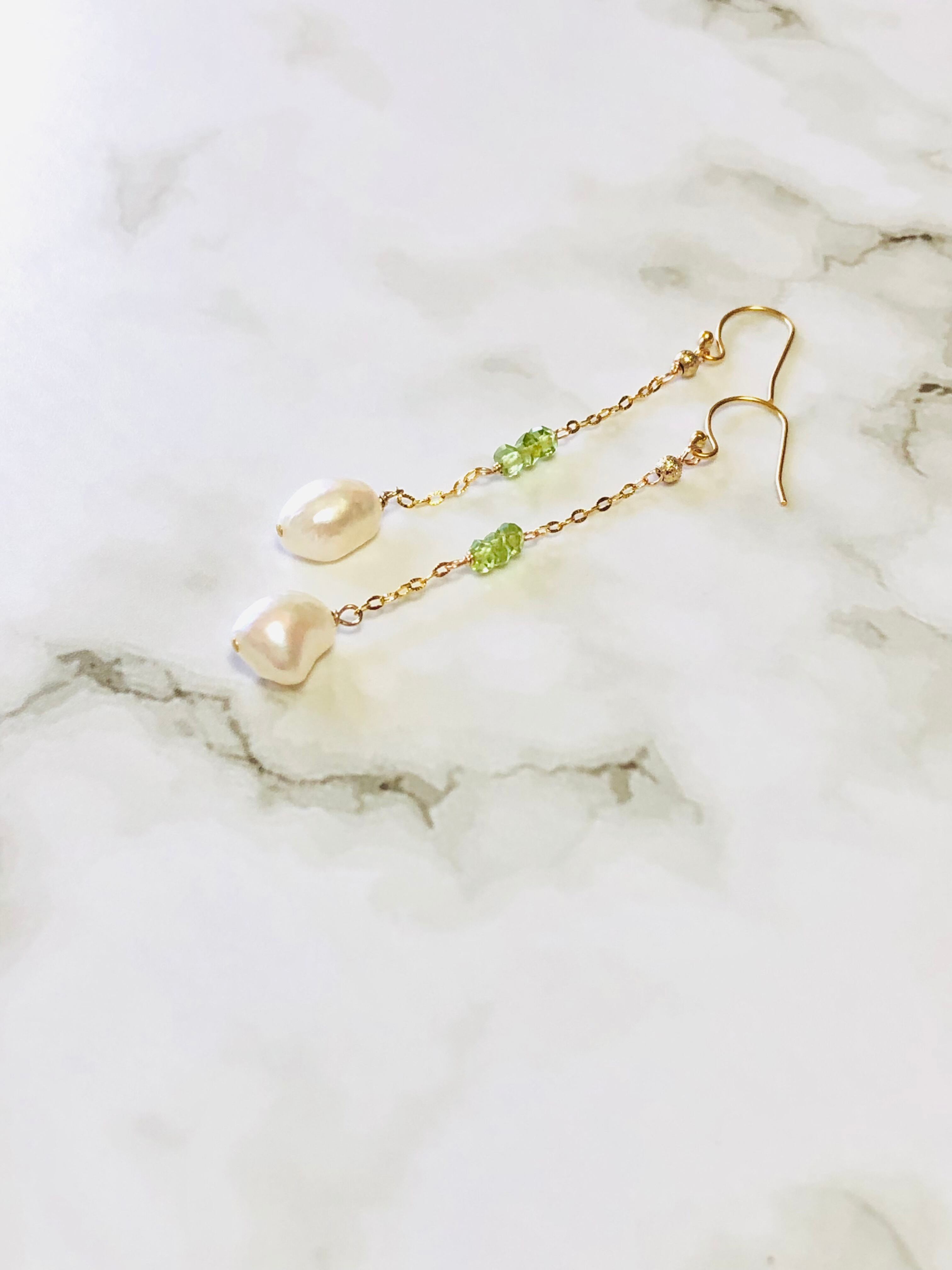 大粒の淡水パールバロックに美しい宝石質のペリドットを使用したピアスです。