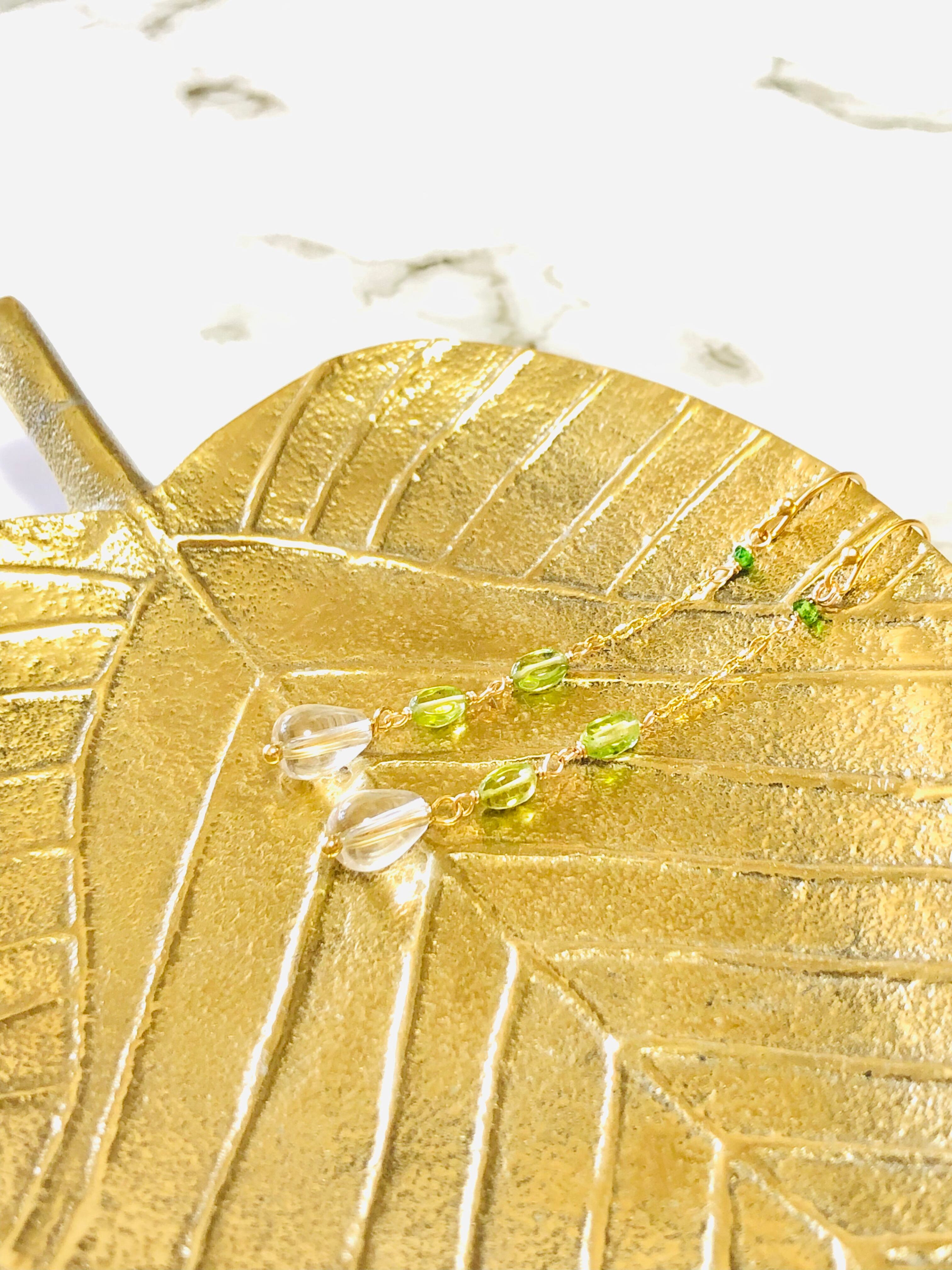 つるんとしたクリスタルのドロップに美しい宝石質のペリドットのタンブルを使用したピアスです。