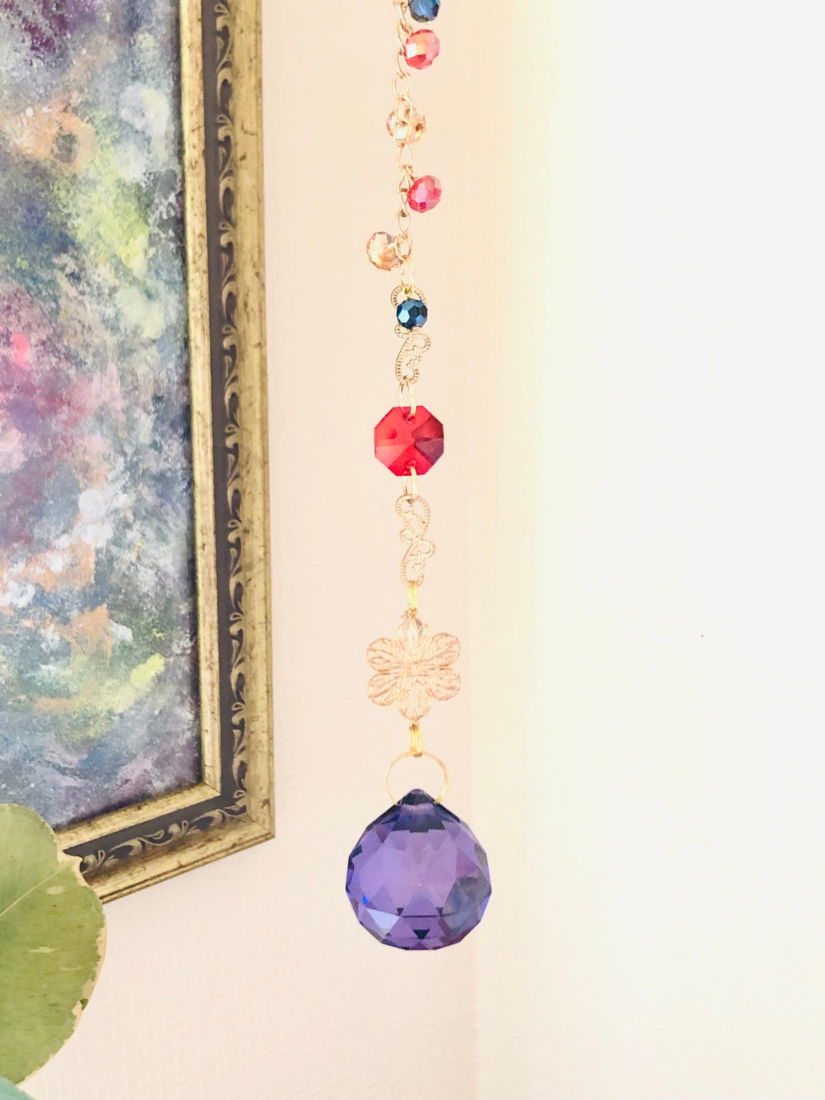 果実が実っているようにカラフルなビーズ達を沢山揺らし、パープルカラーのエレメントを合わせたサンキャッチャーです。