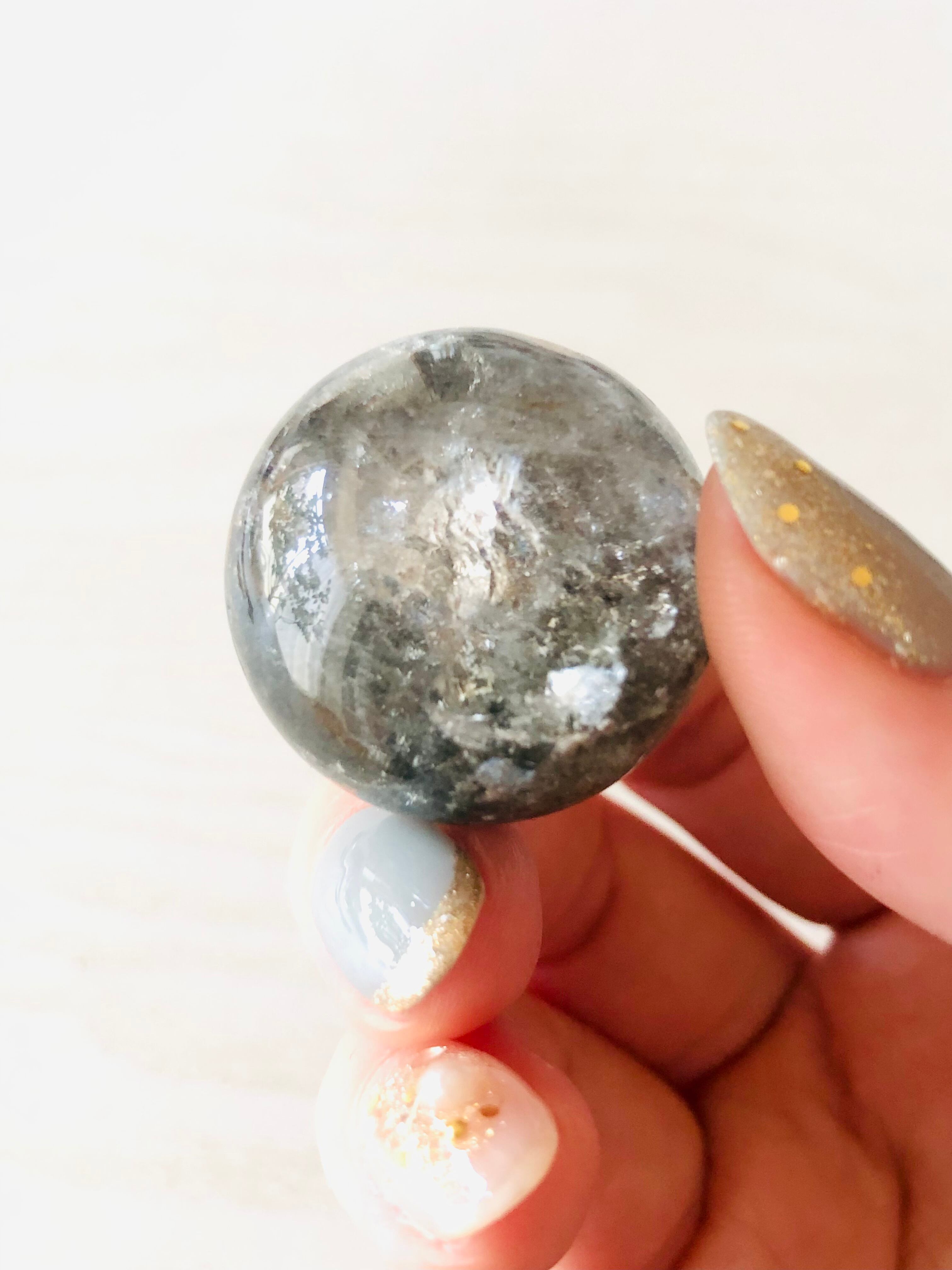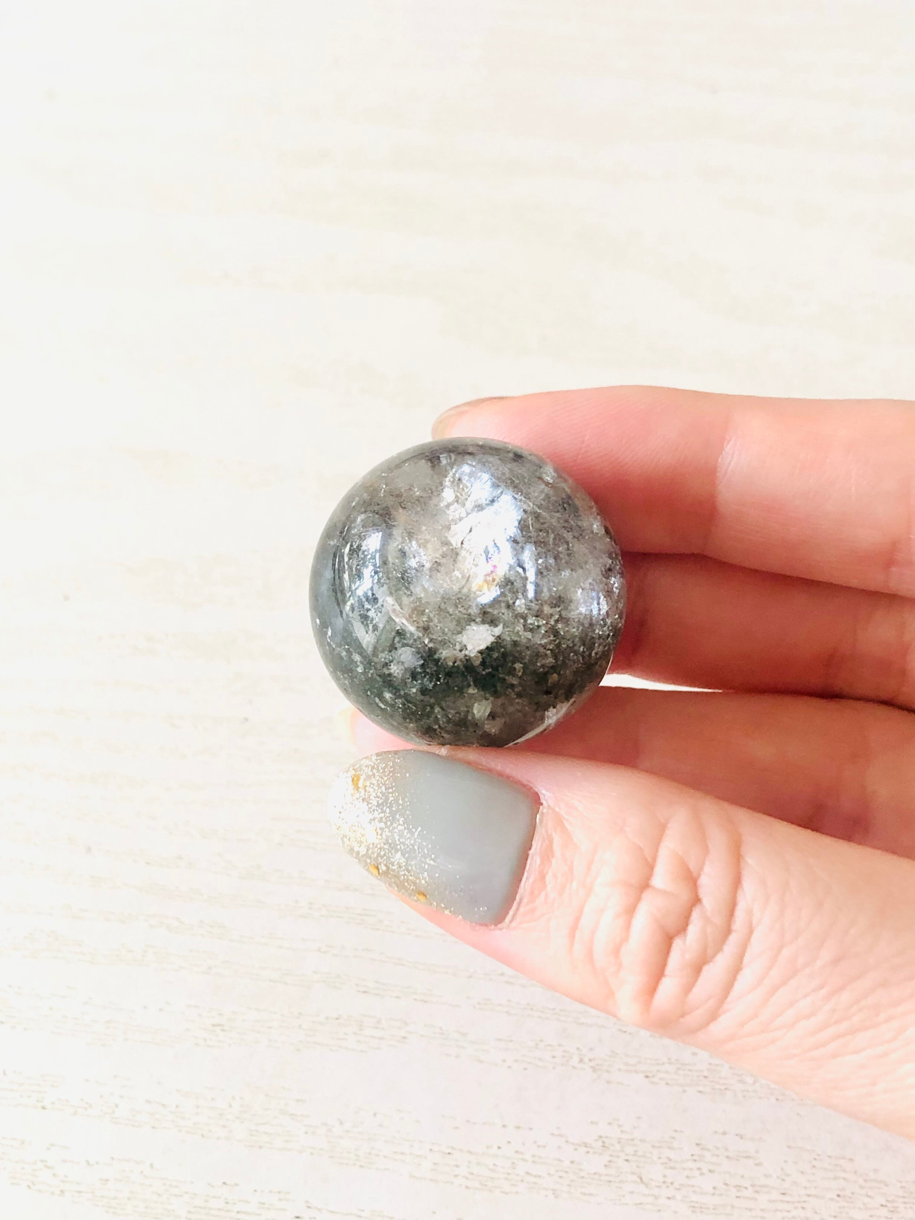 全体的にクローライトで濃いグリーンてすが、クラック部分には小さな虹が入り、光を反射して白銀に見えます。