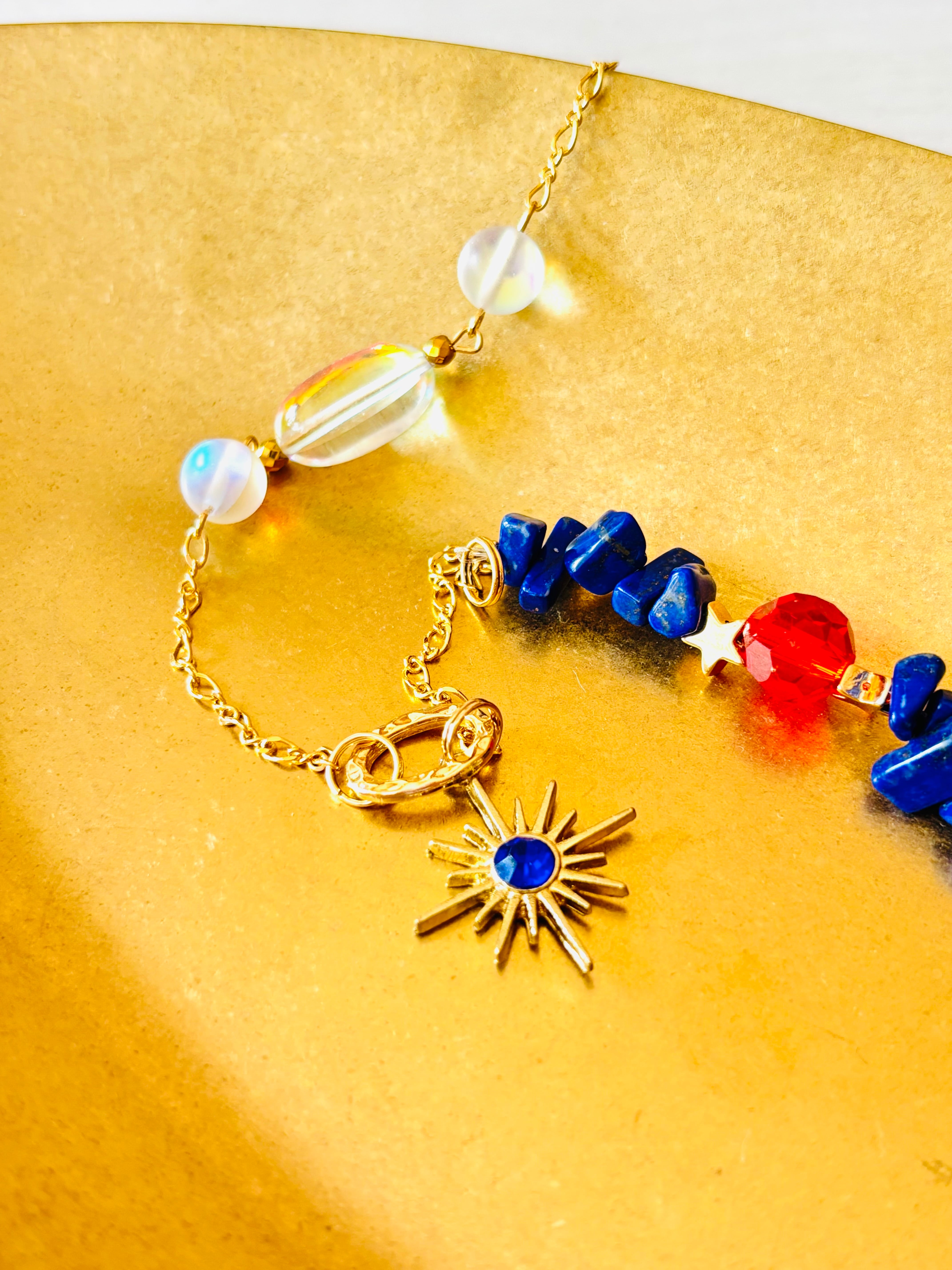 こちらは、幸運を呼び寄せる石ラピスラズリのさざれ石に青星チャームを繋ぎました。