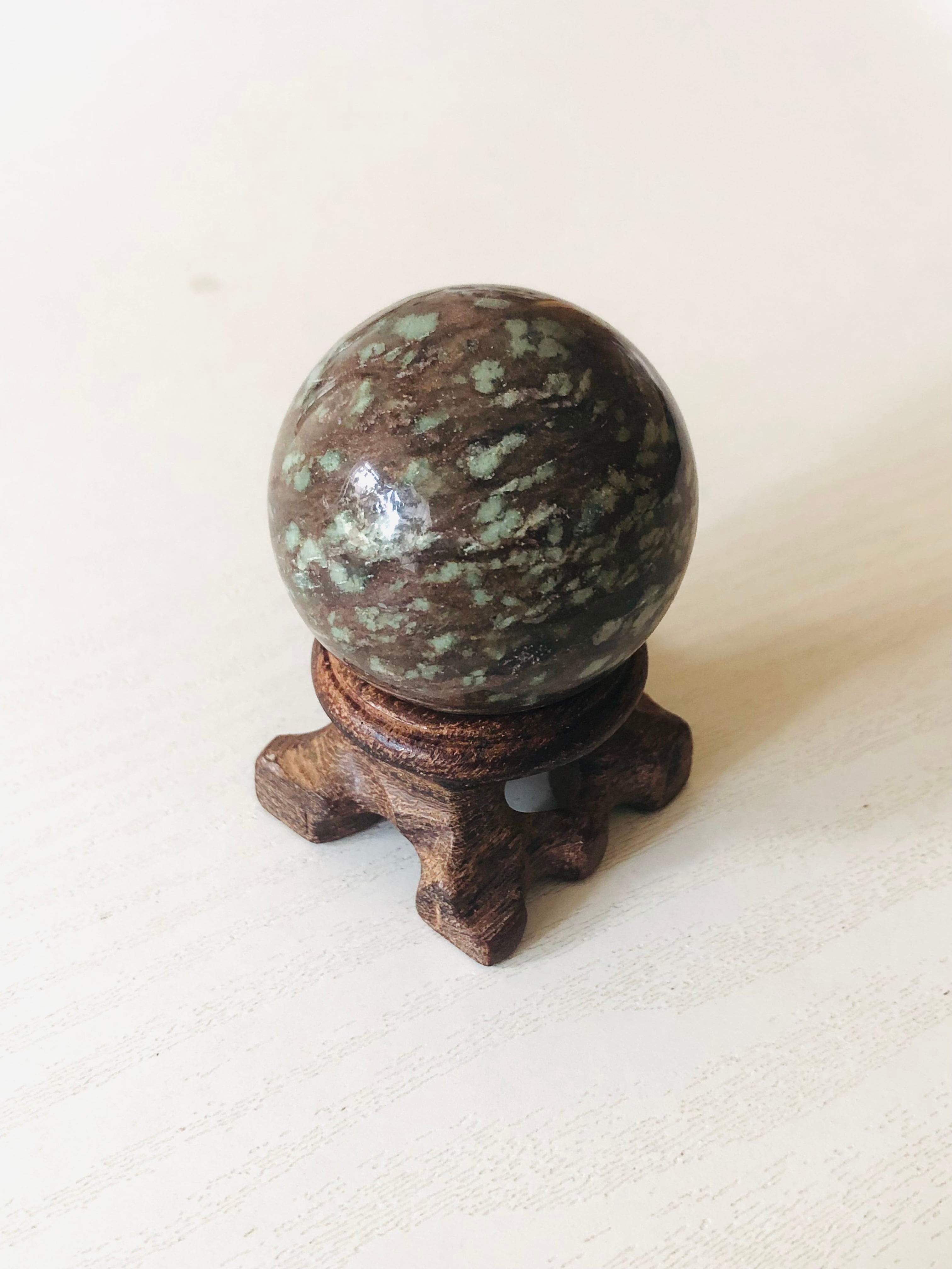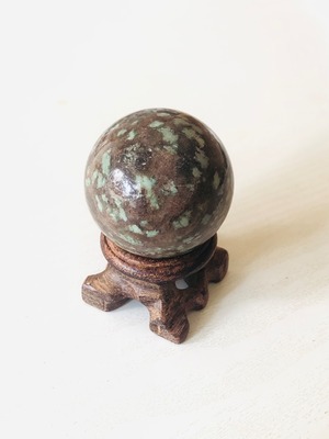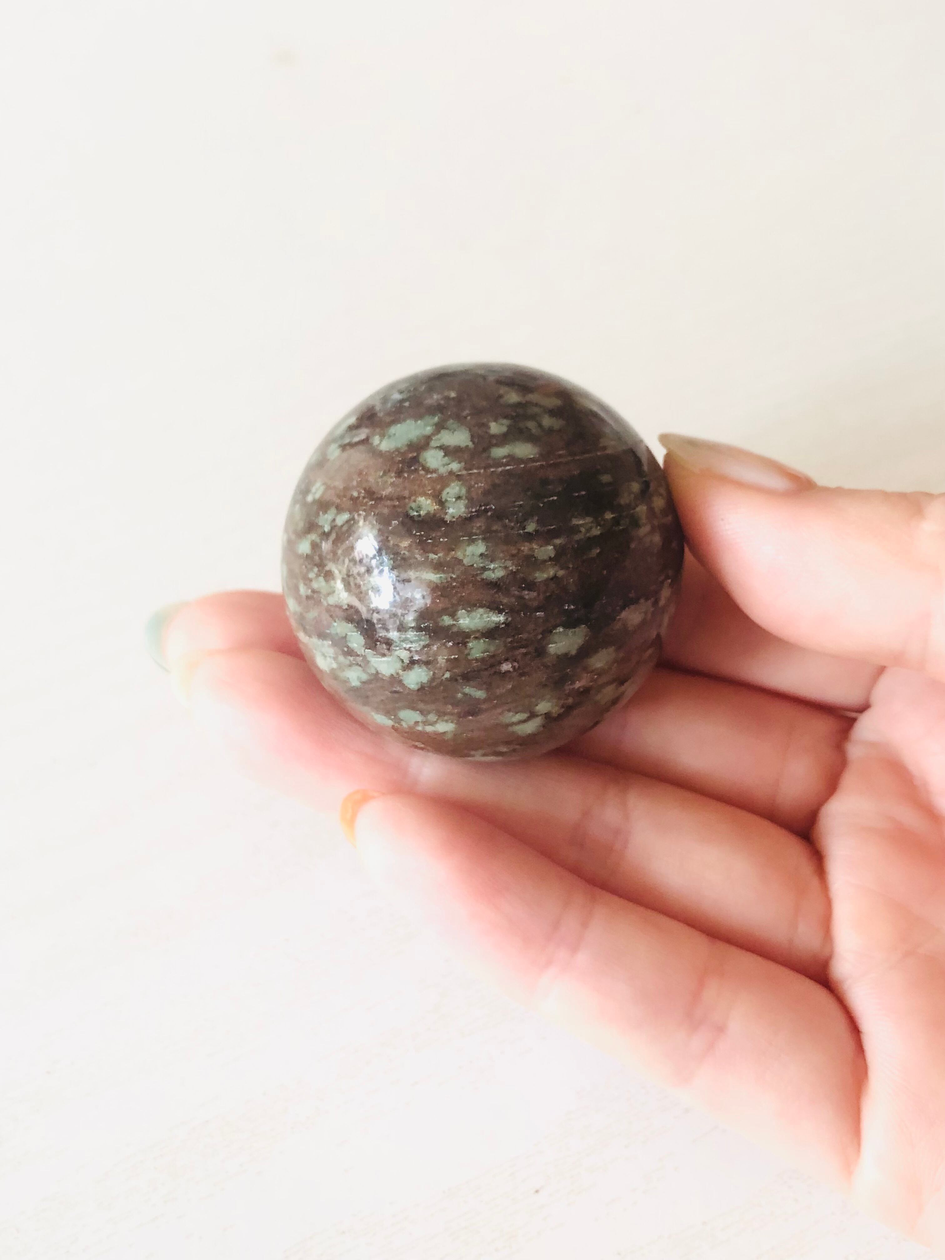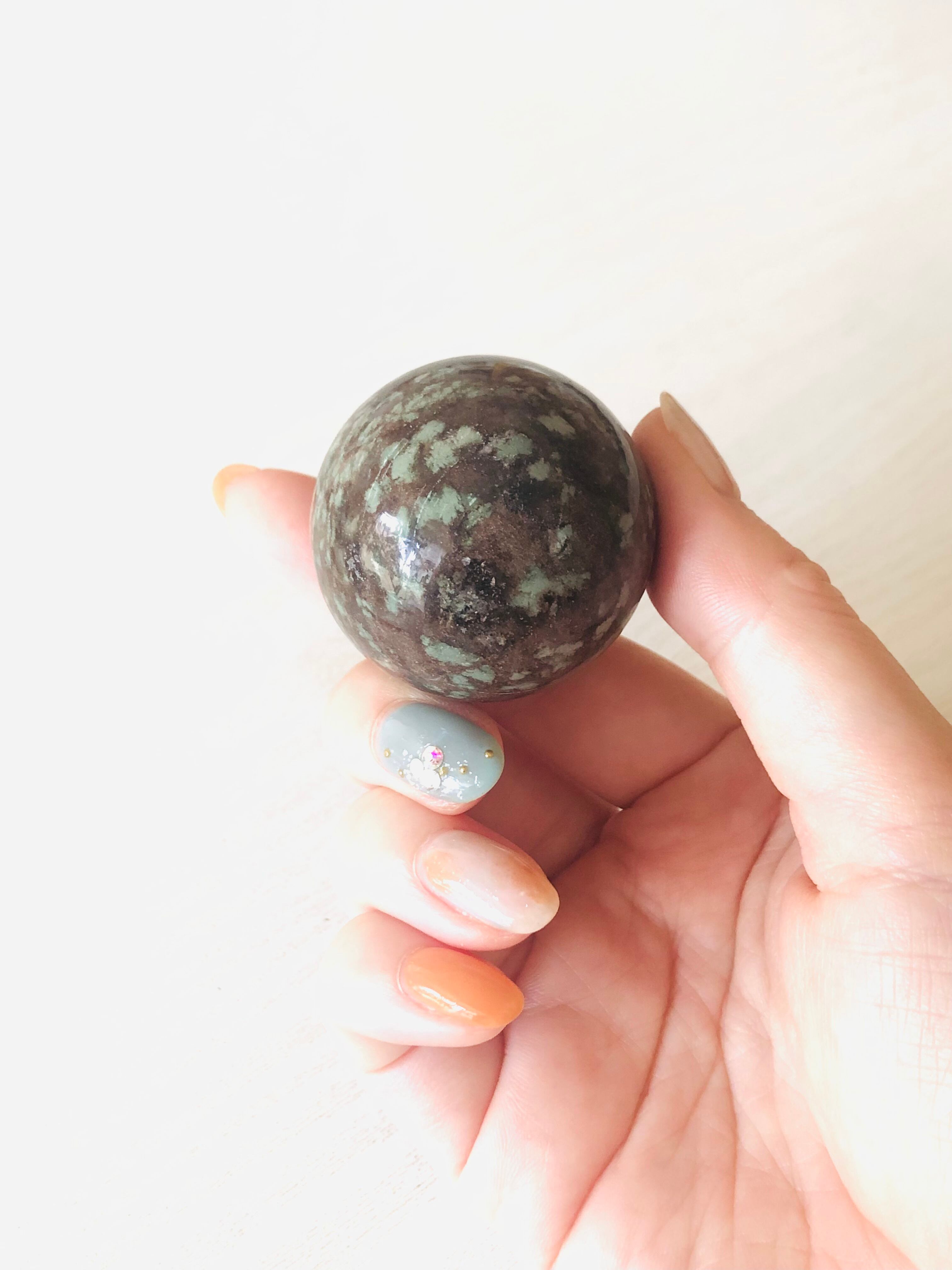 茶色のベースの中にグリーンのエジリンが散りばめられた個性的な石で、他にはない独特な色味と模様がとても魅力的です。