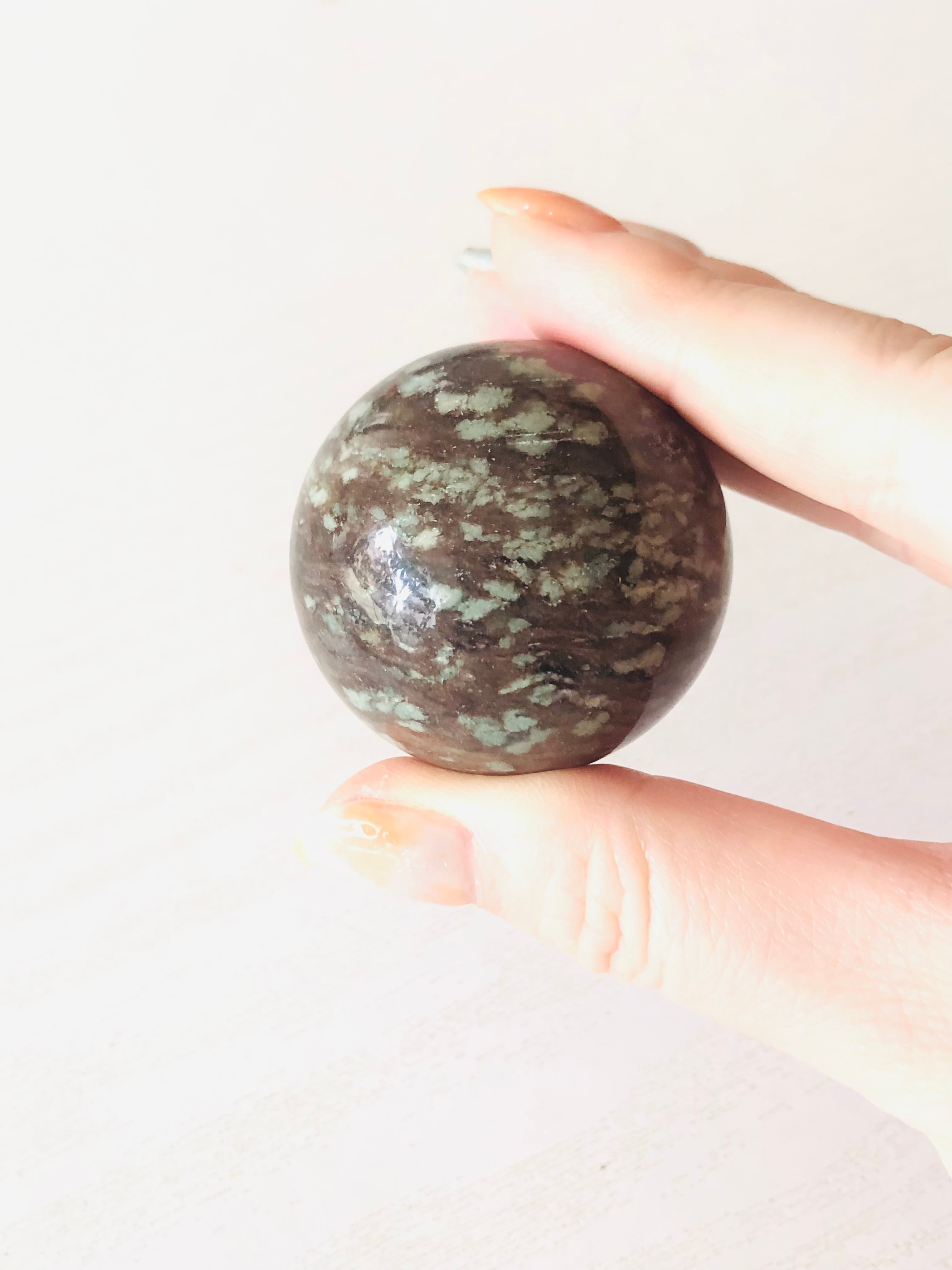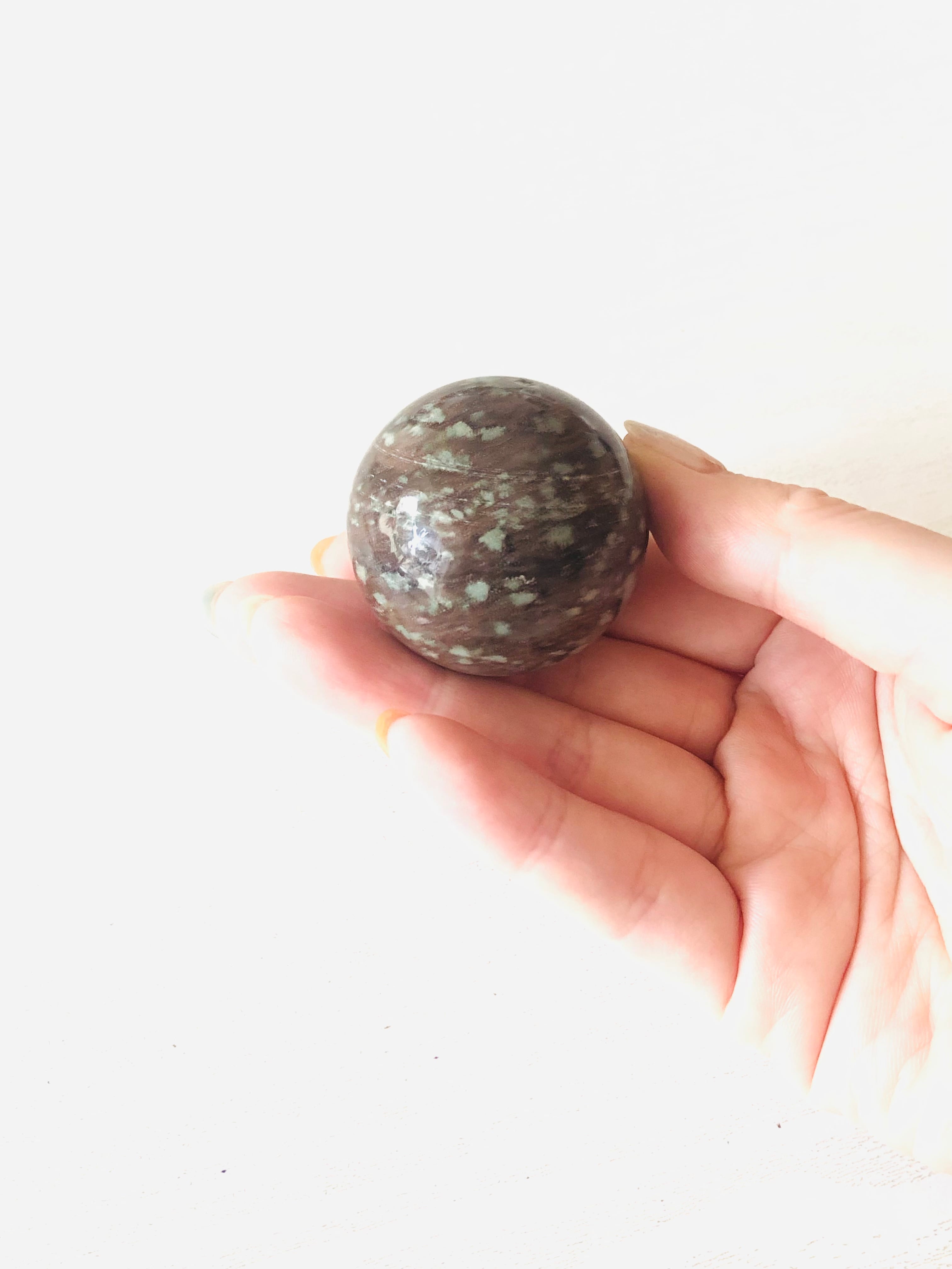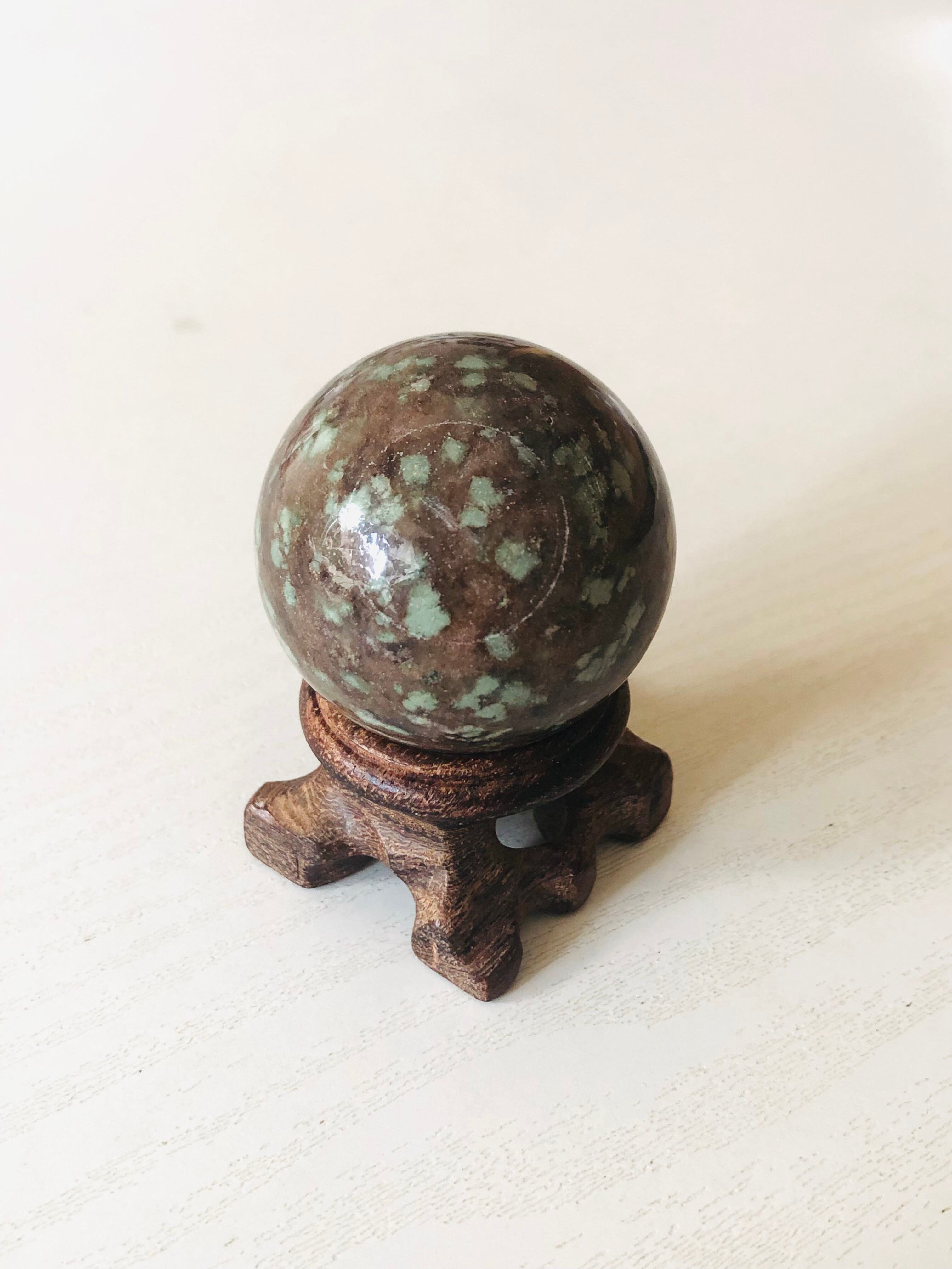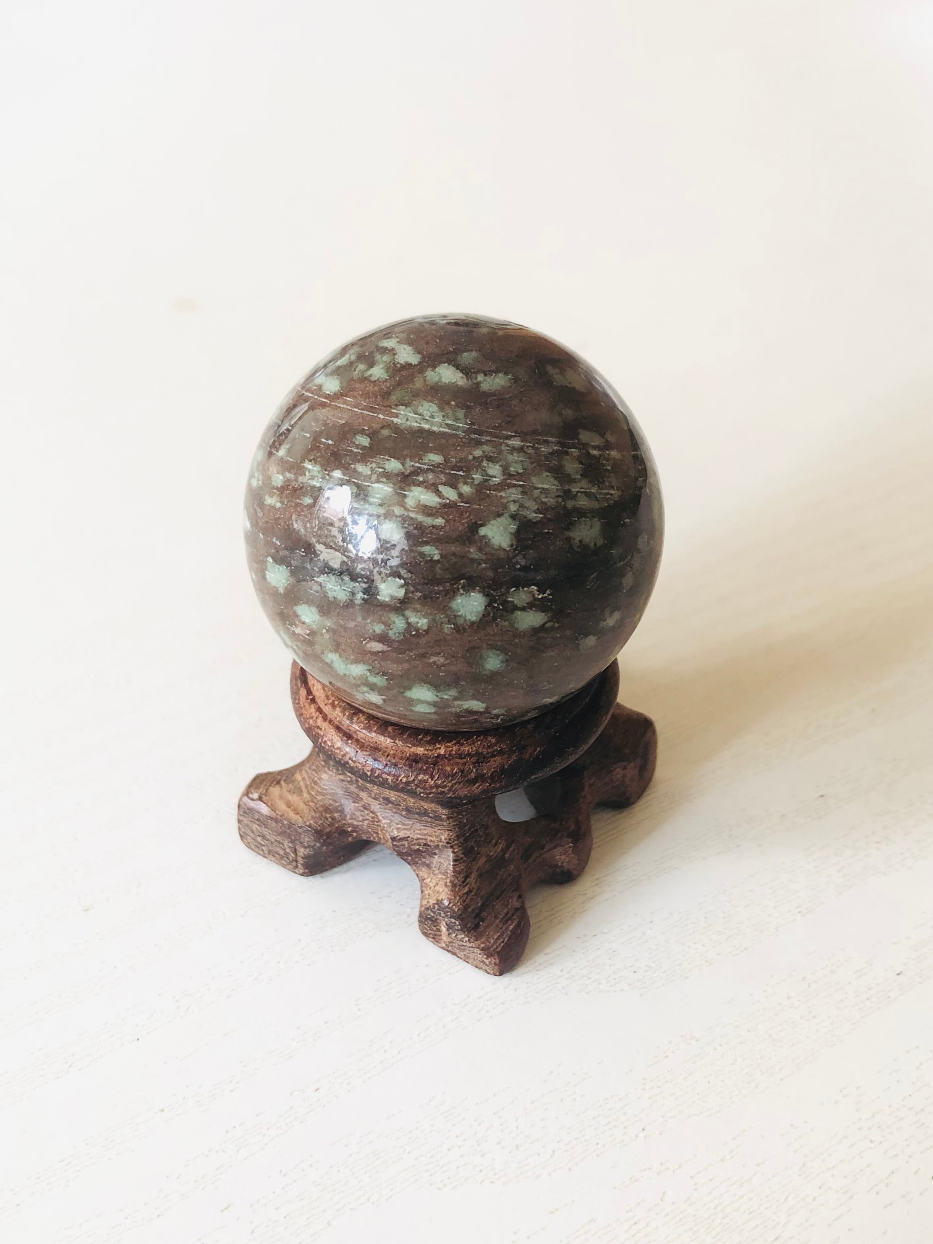 茶色のベースの中にグリーンのエジリンが散りばめられた個性的な石で、他にはない独特な色味と模様がとても魅力的です。