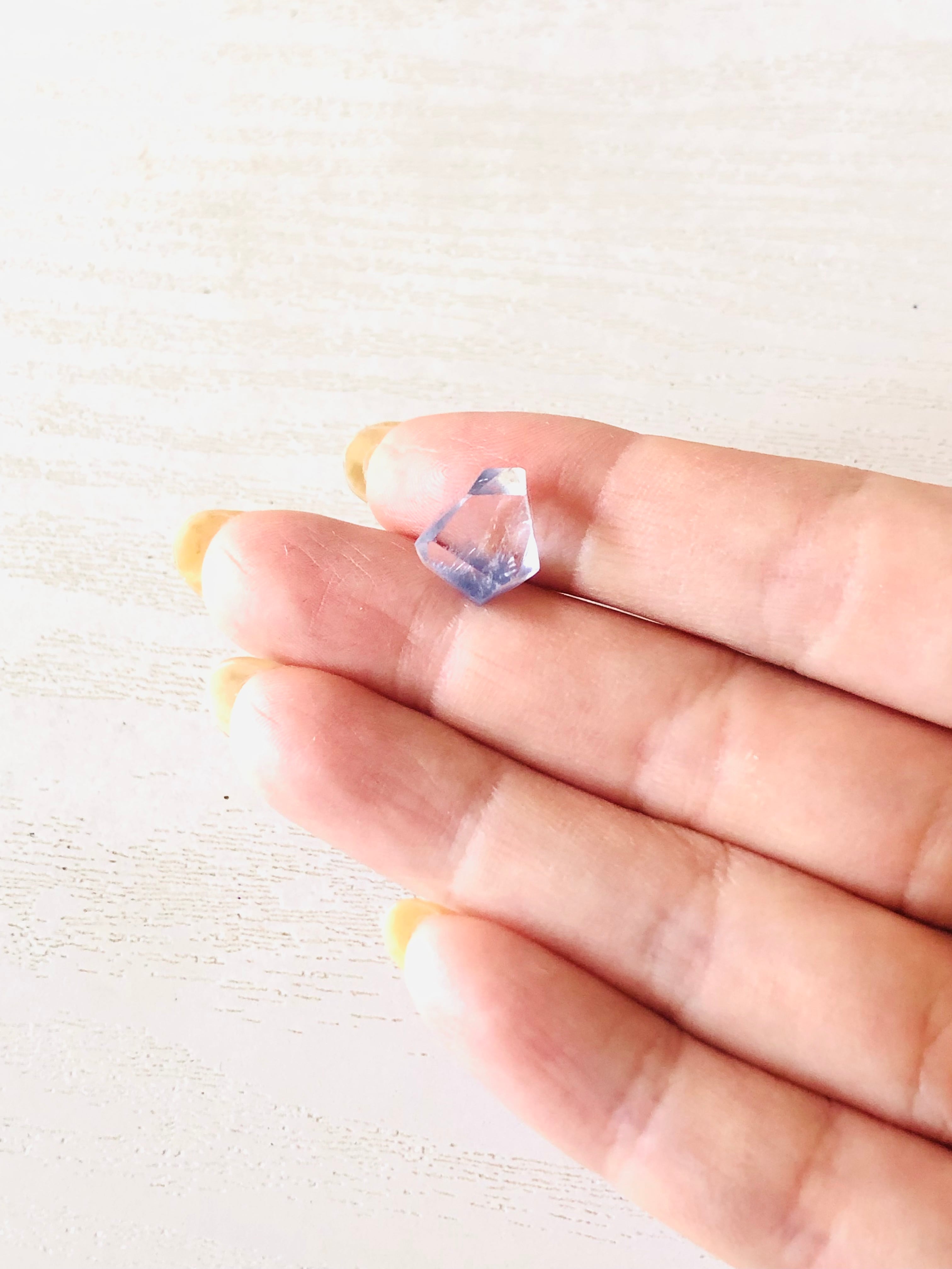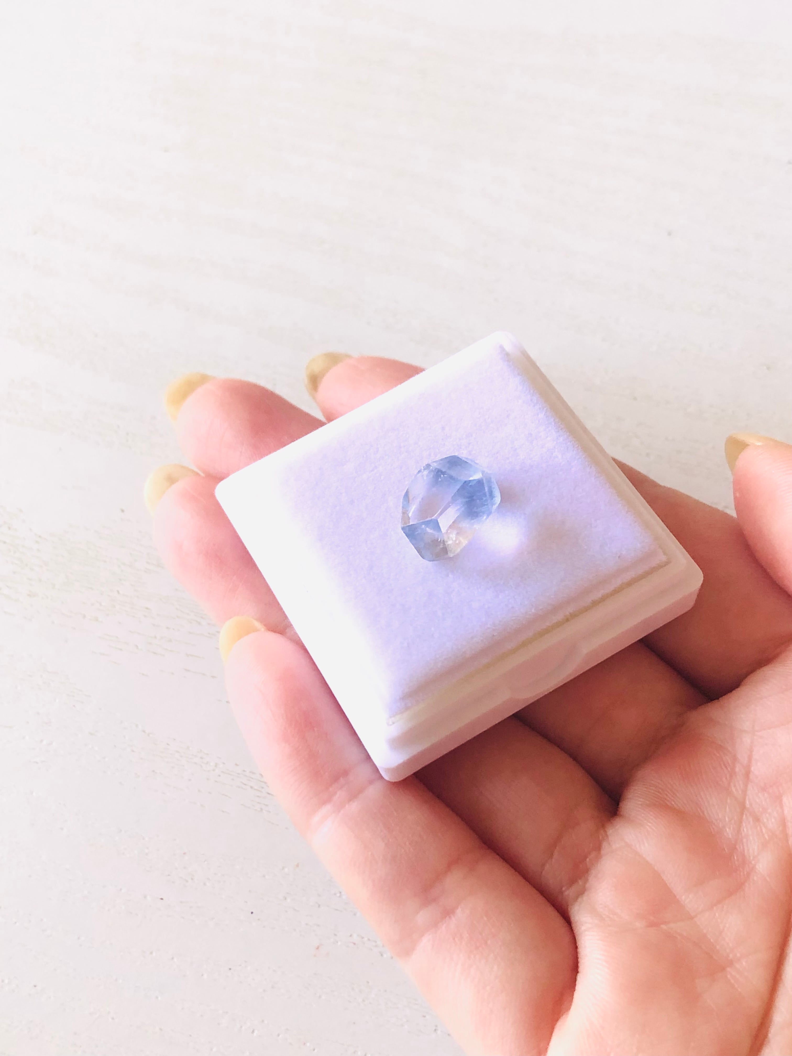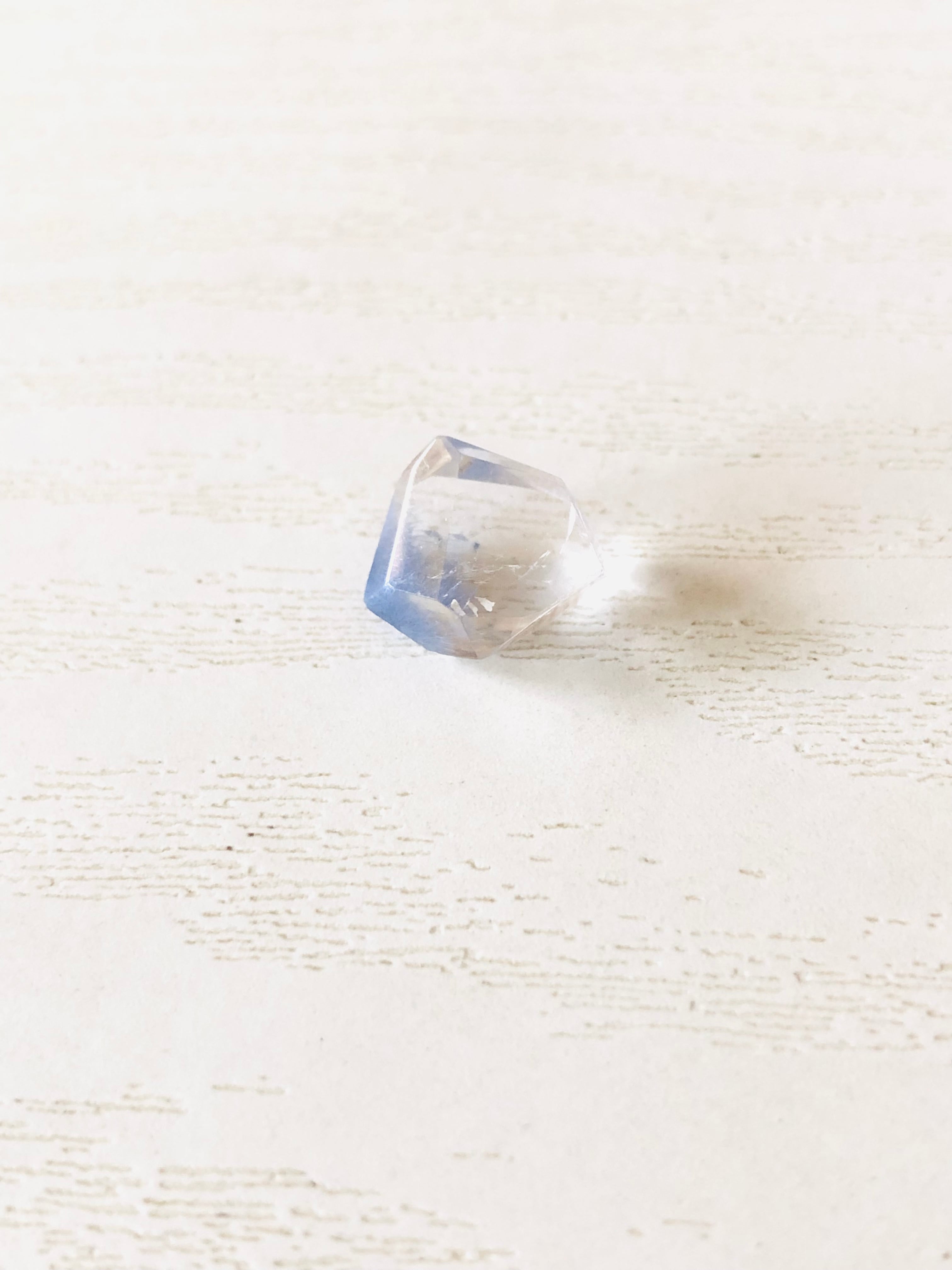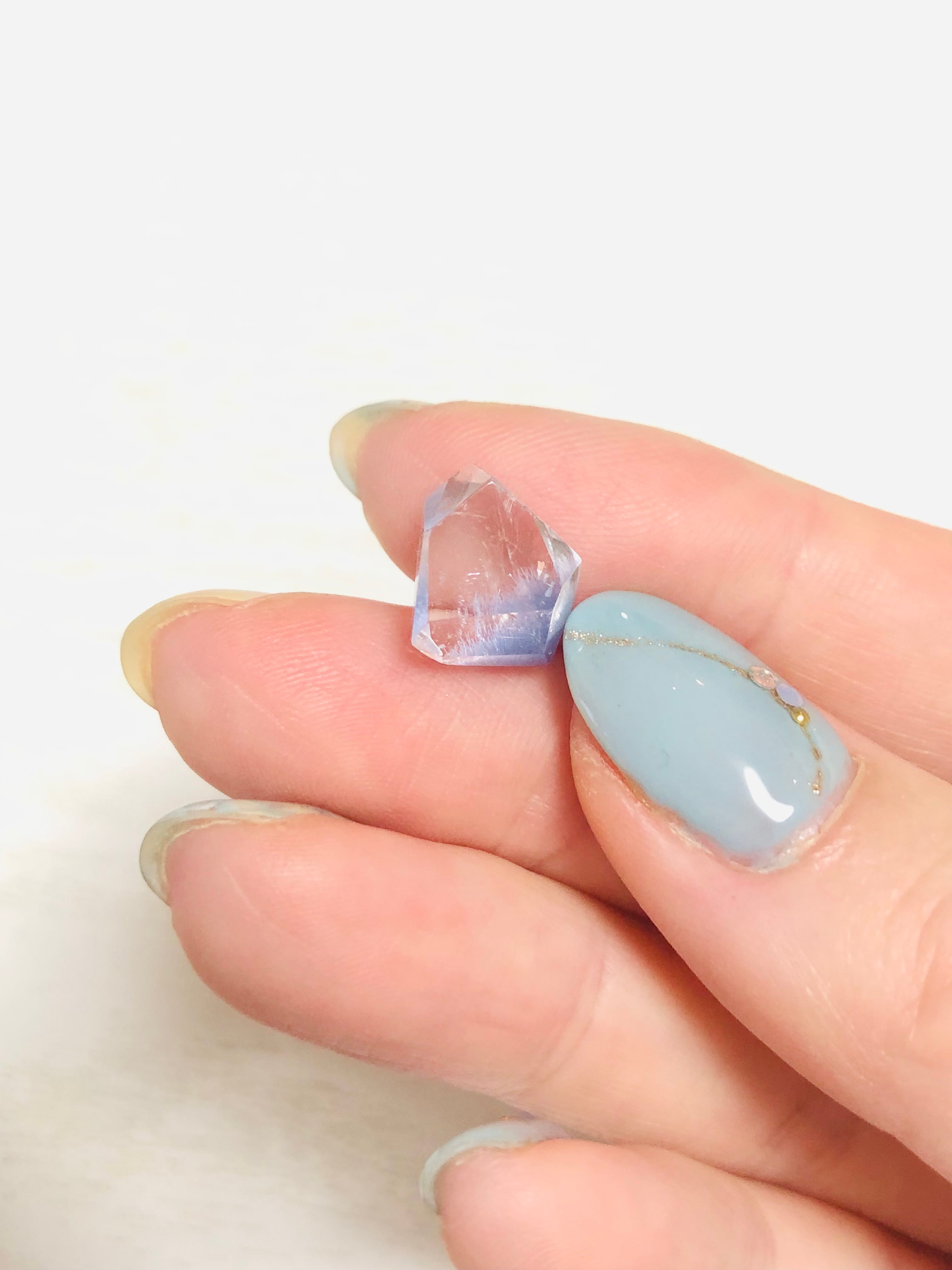 こちらは、透明感抜群の水晶の中にとても繊細な青い花が咲いているラフカットタンブルです。