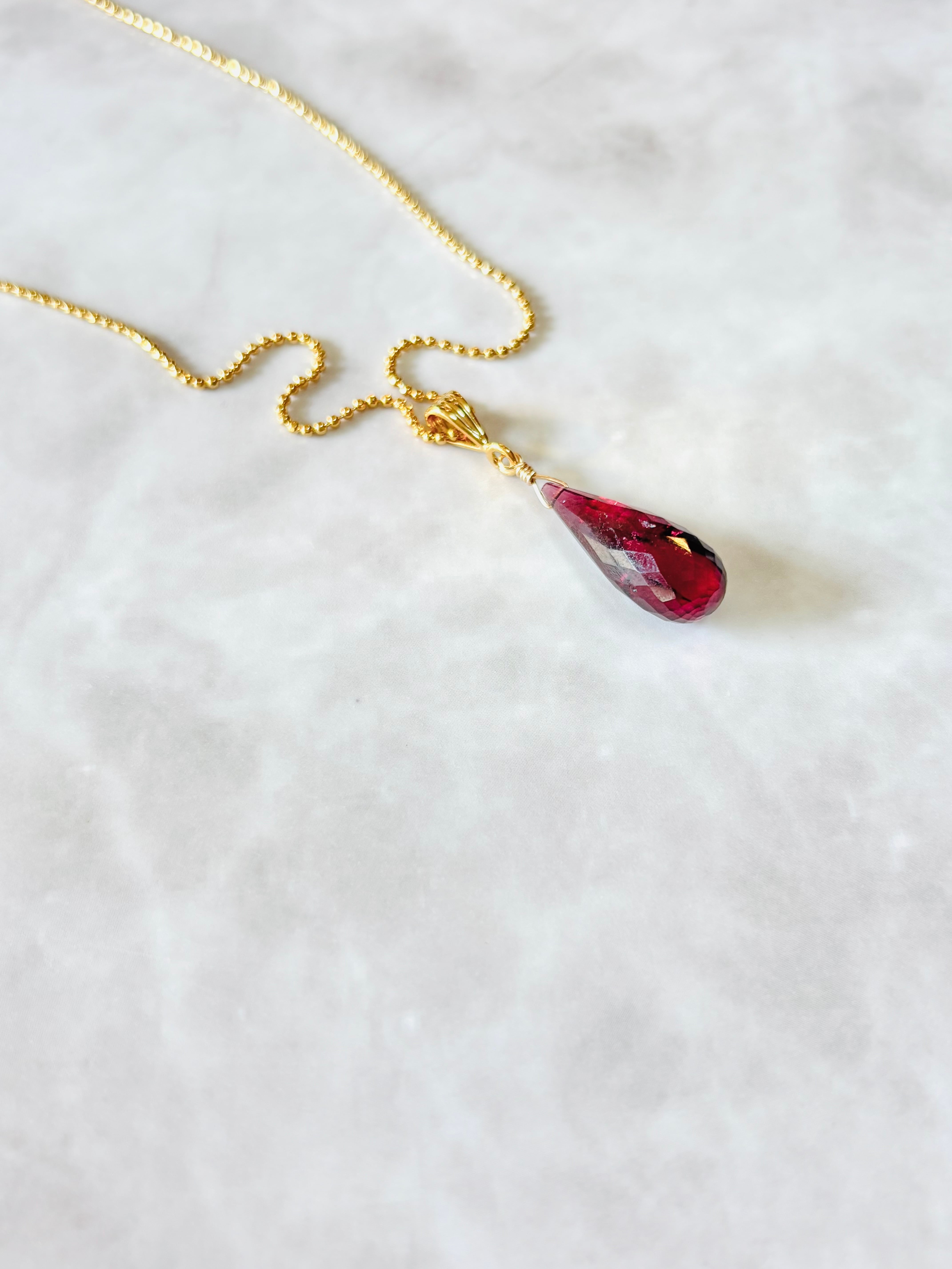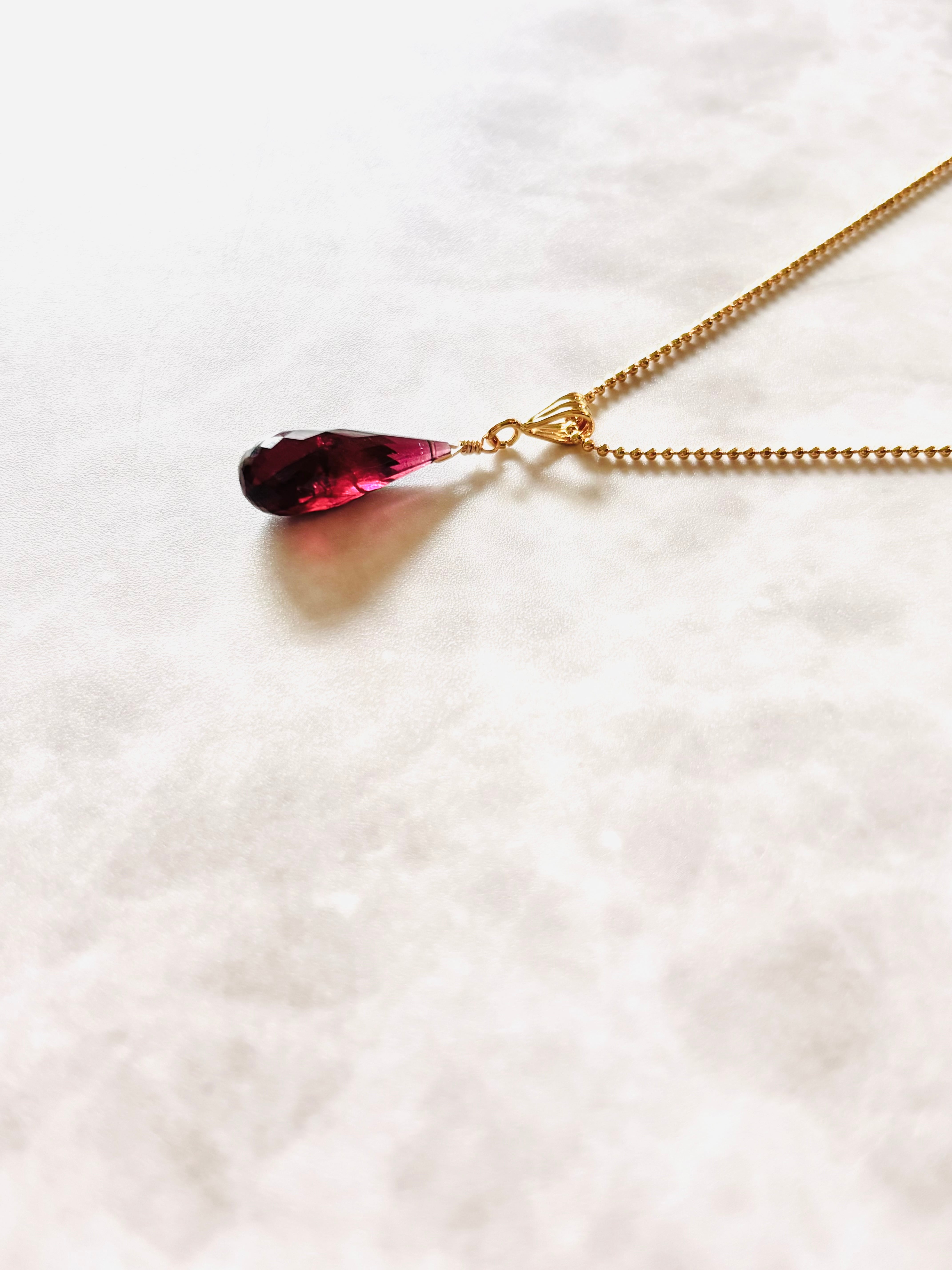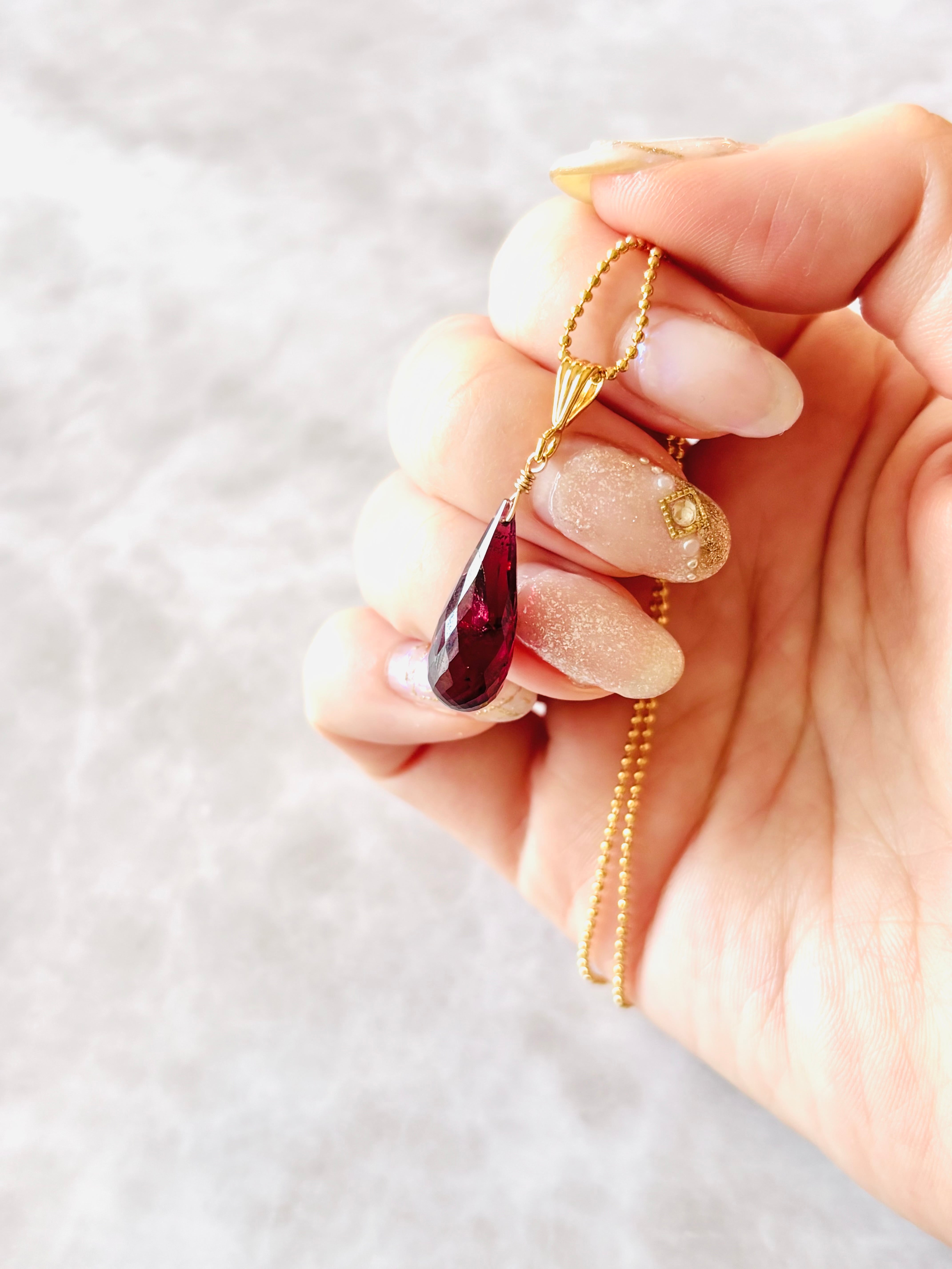 光にかざすと深みのある赤紫の色味とカット面のきらめきで美しく輝きます。
