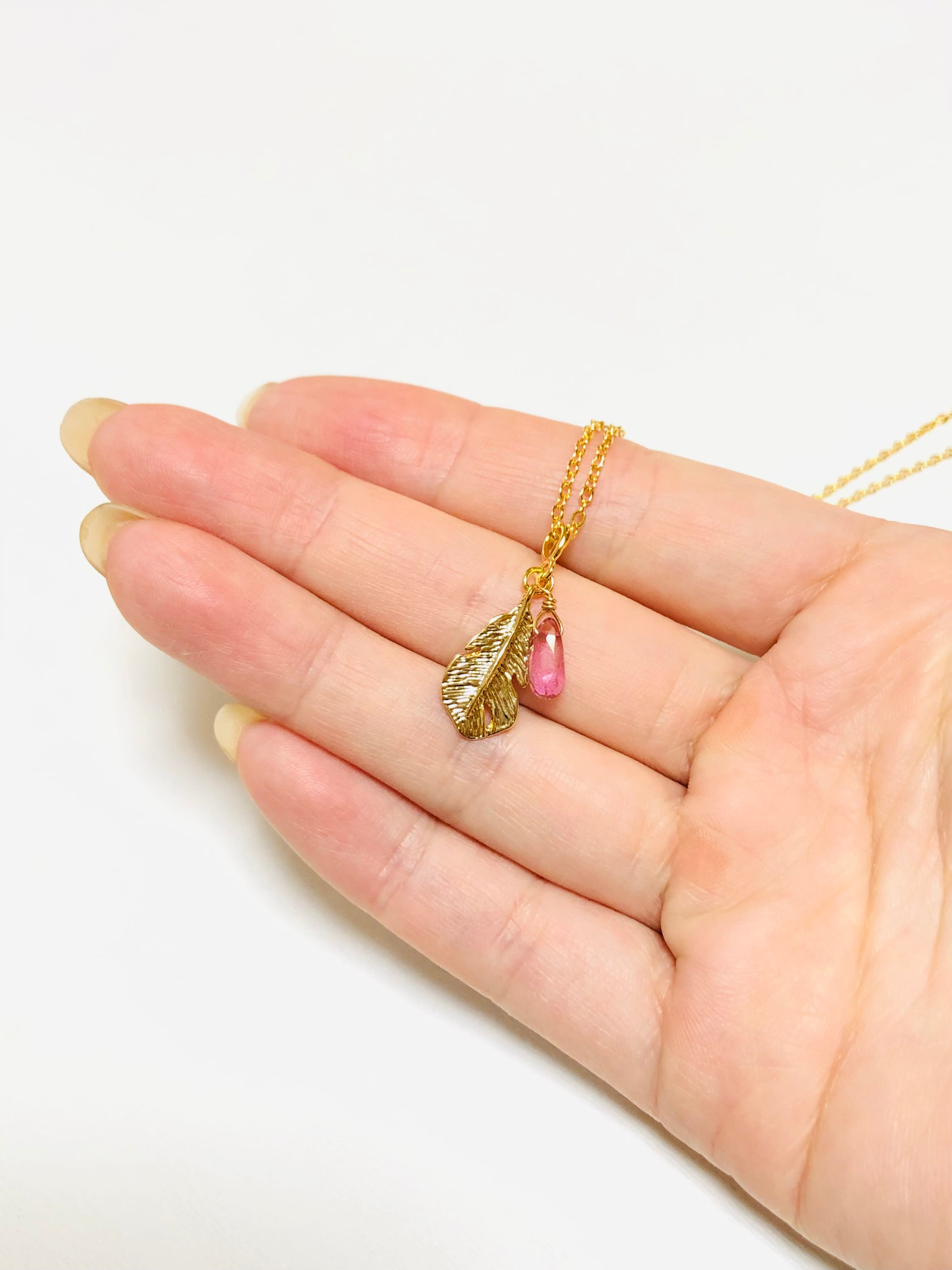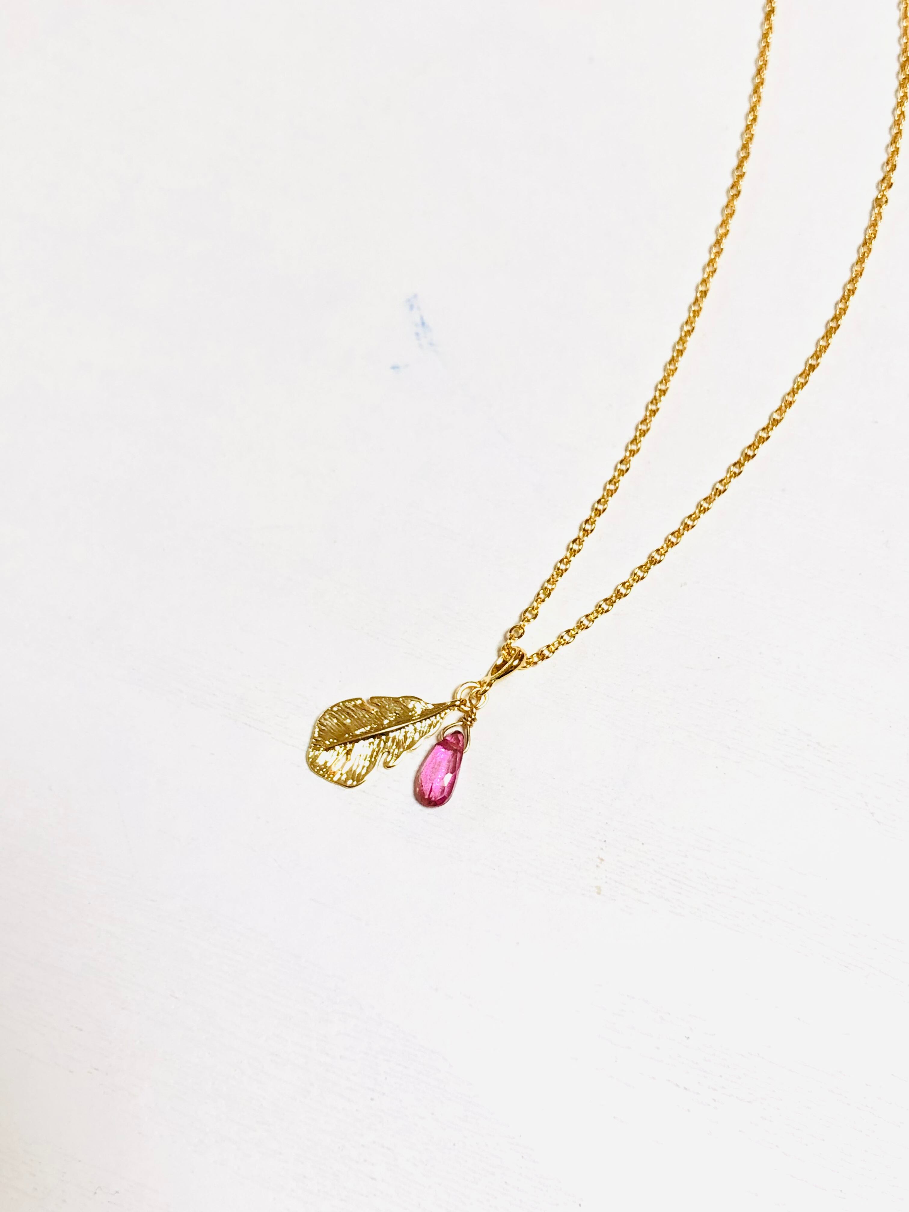 宝石質ピンクトパーズと羽根のネックレス