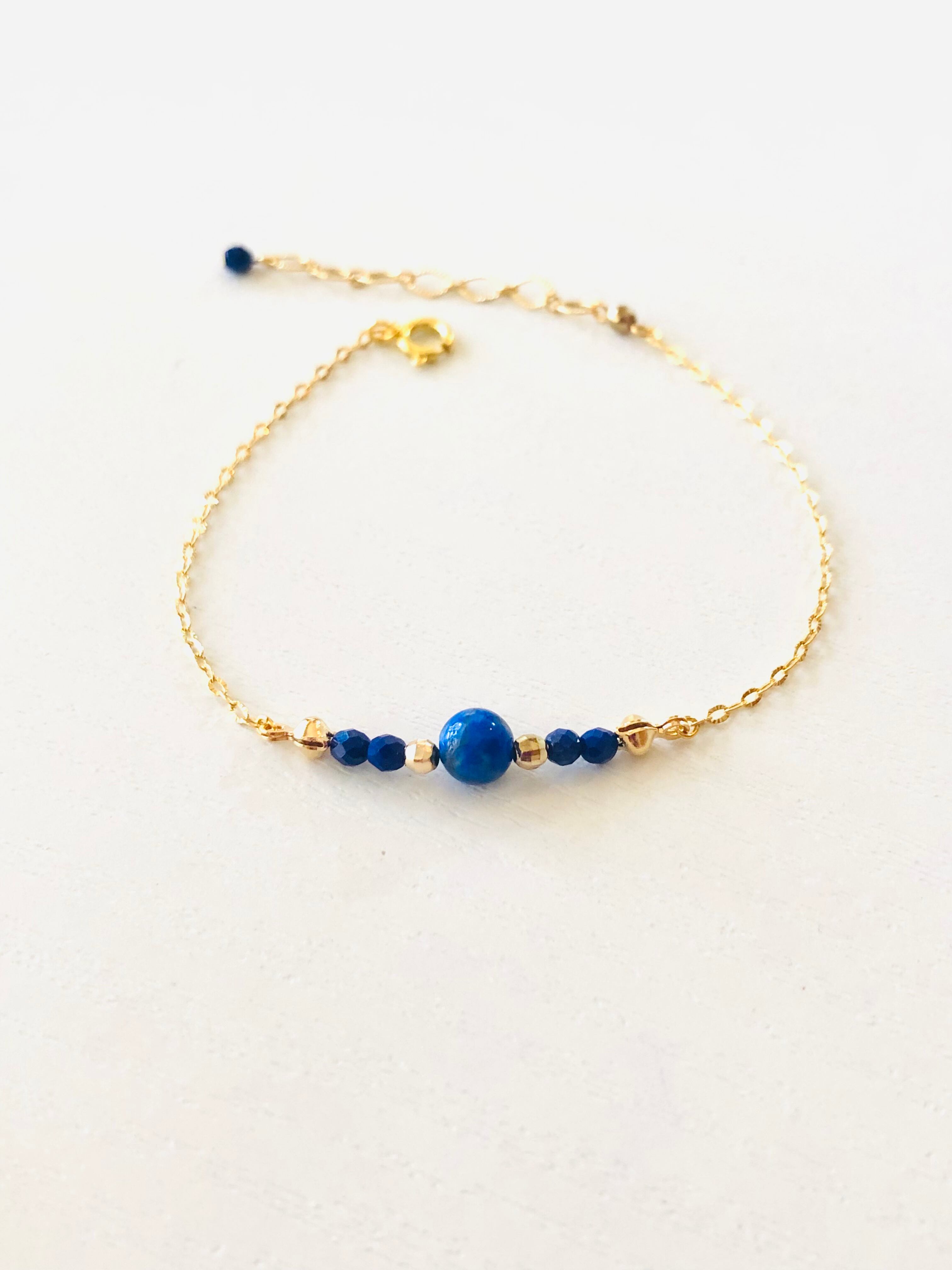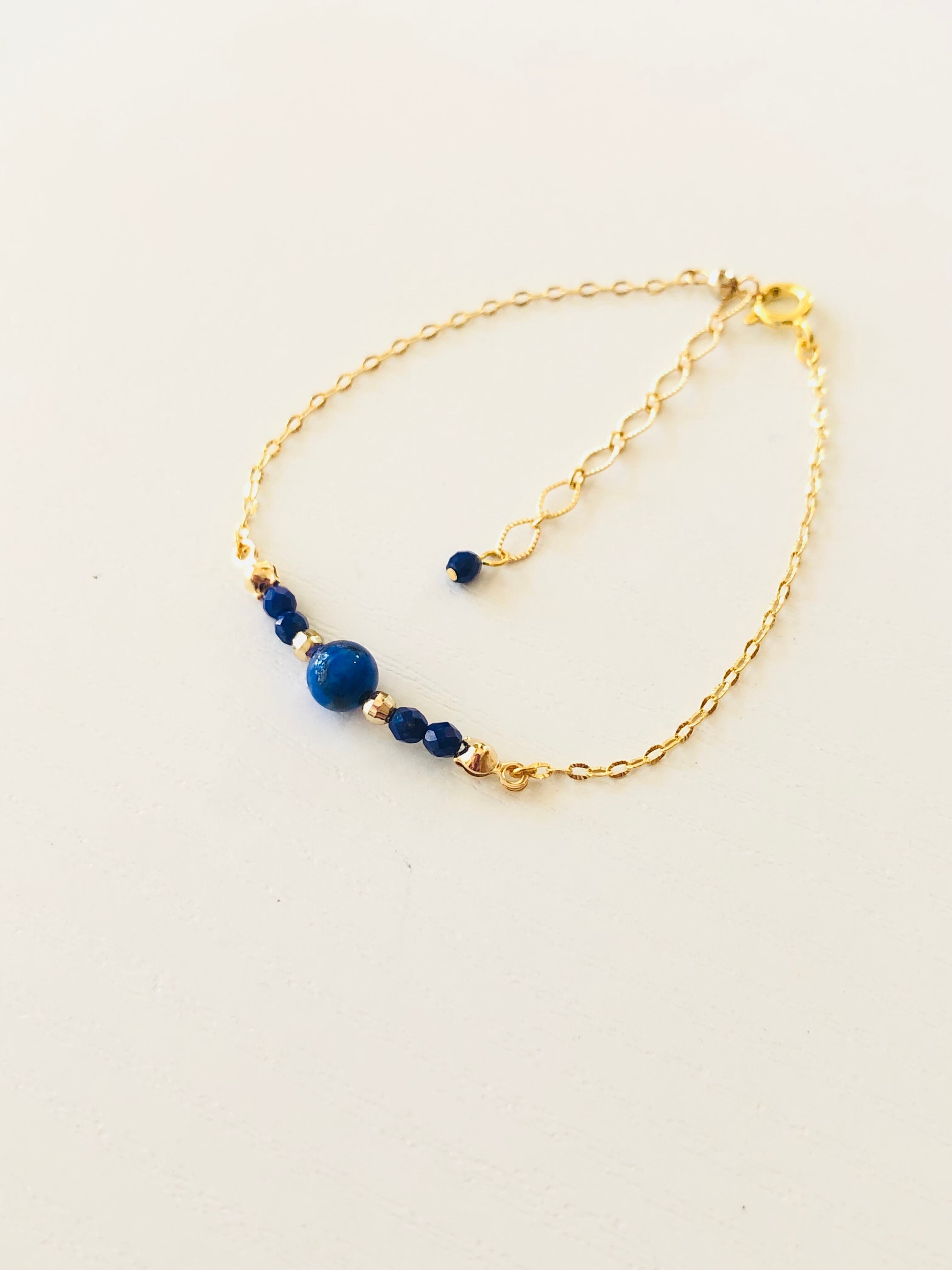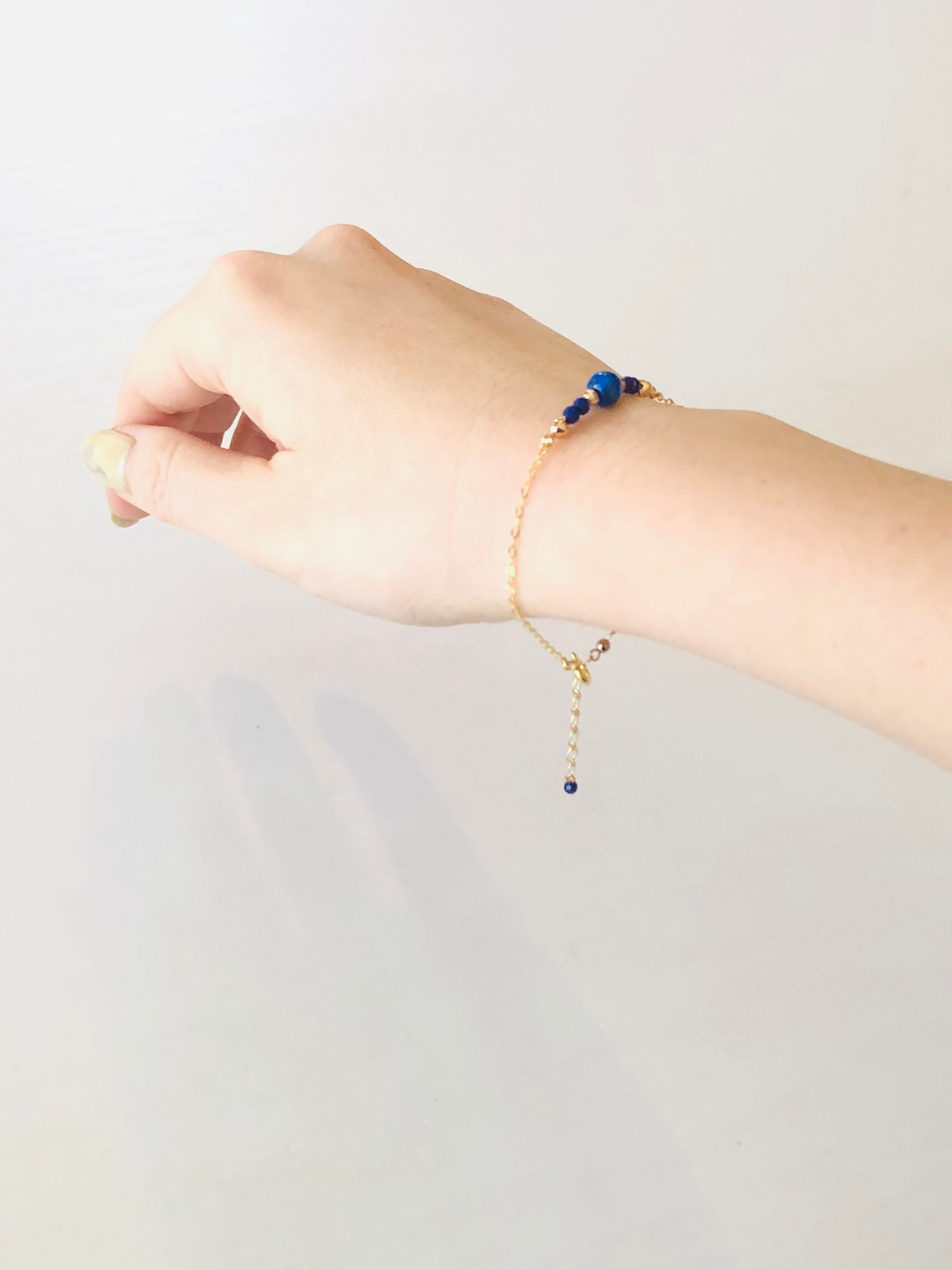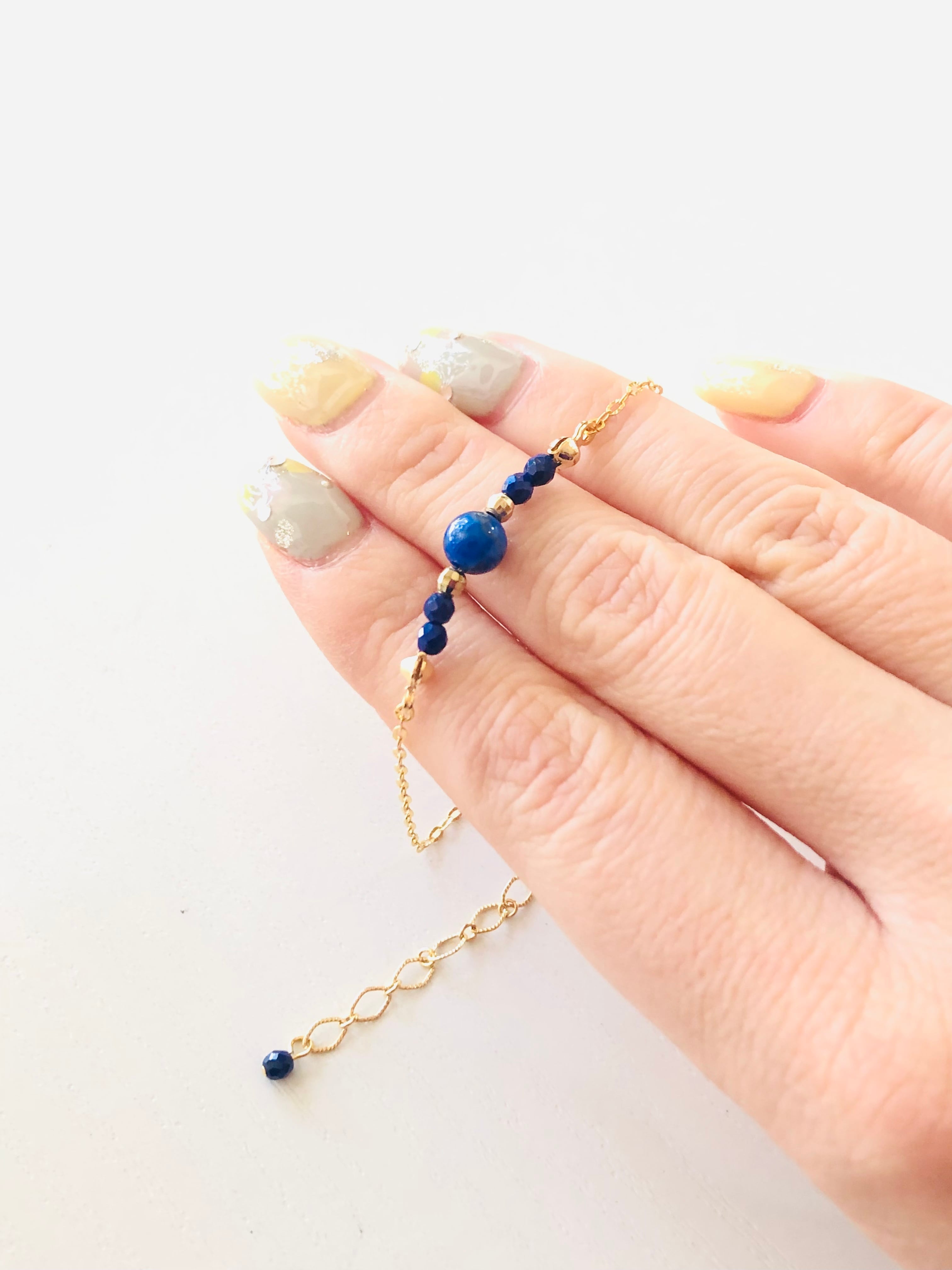 美しい色味の6mm玉にカットされた小粒のラピスラズリと細めのカット小豆チェーンを合わせました。