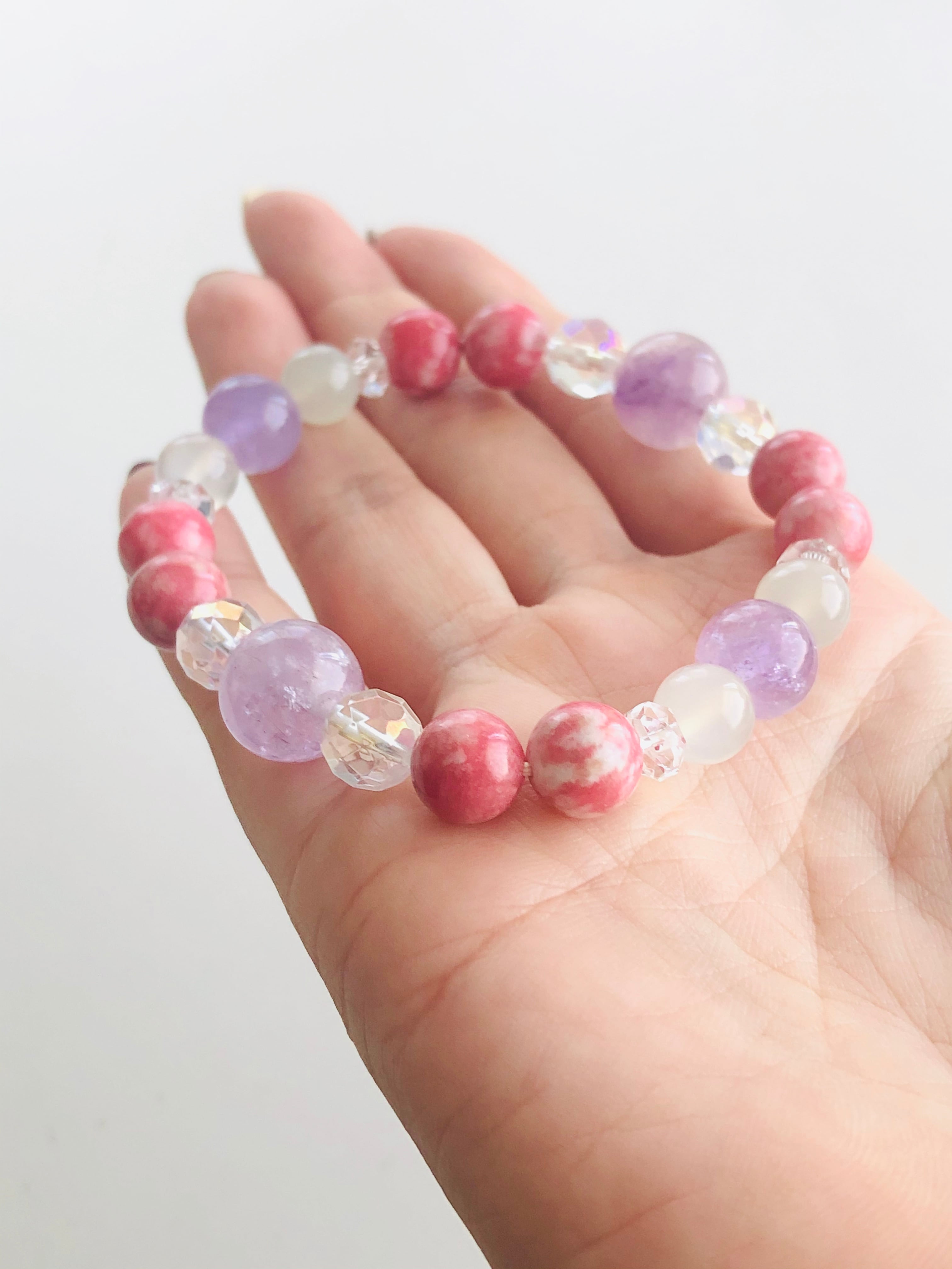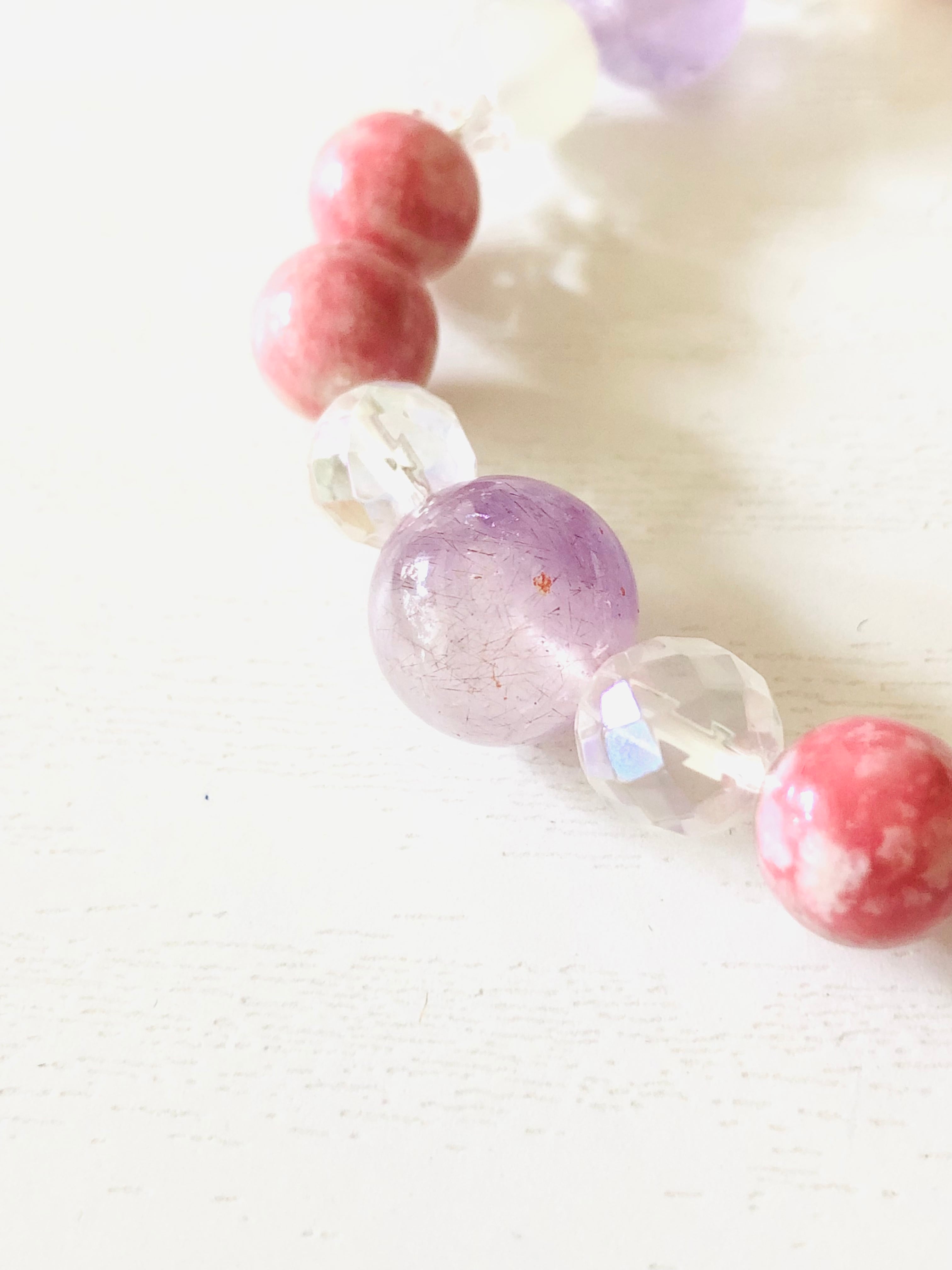 落ち着いたらピンクカラーのチューライトをメインに、ラベンダーアメジストやムーンストーンを繋ぎました。