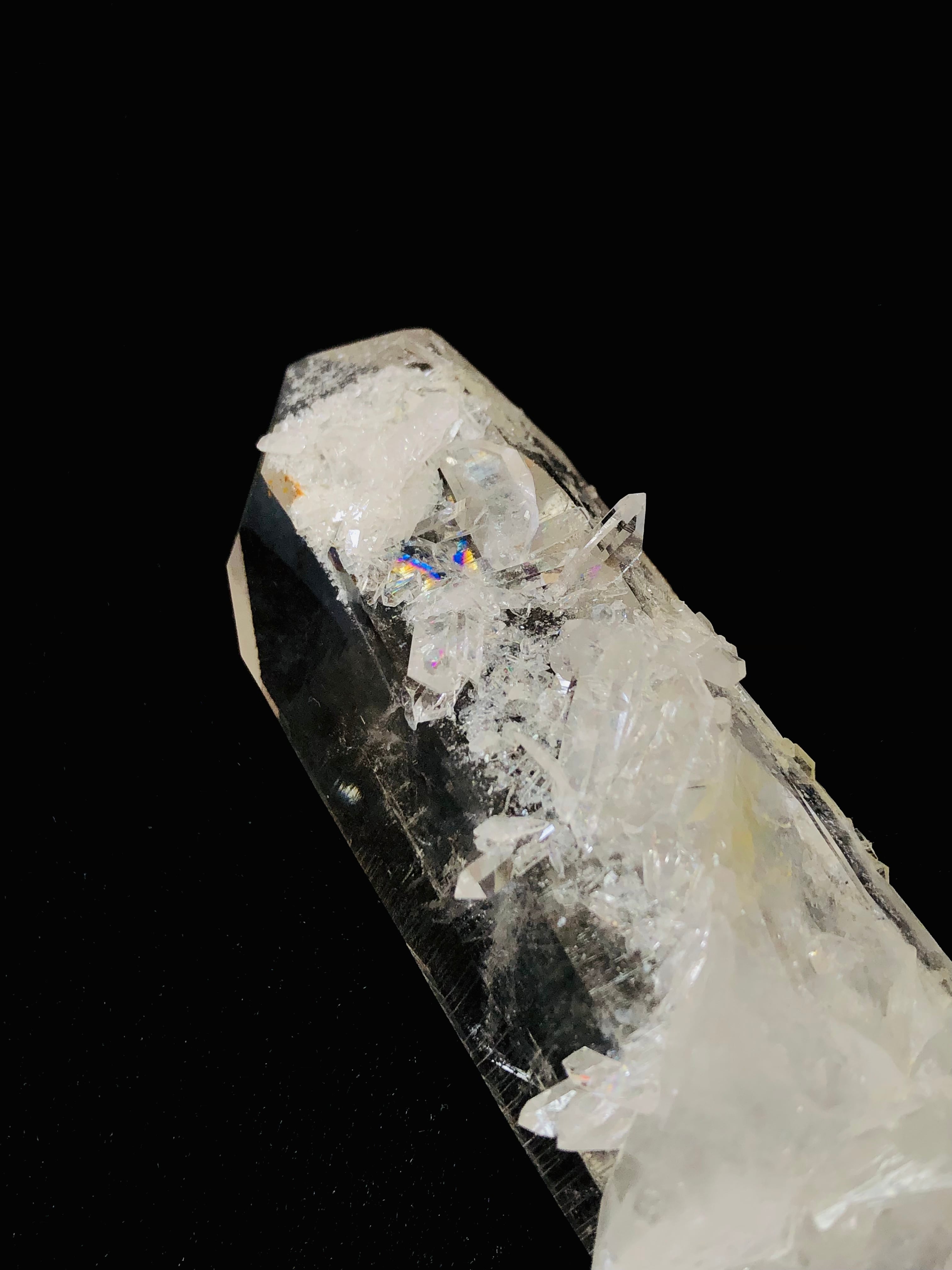 こちらは、水晶の柱面に小さな小さな結晶が花のように咲き、