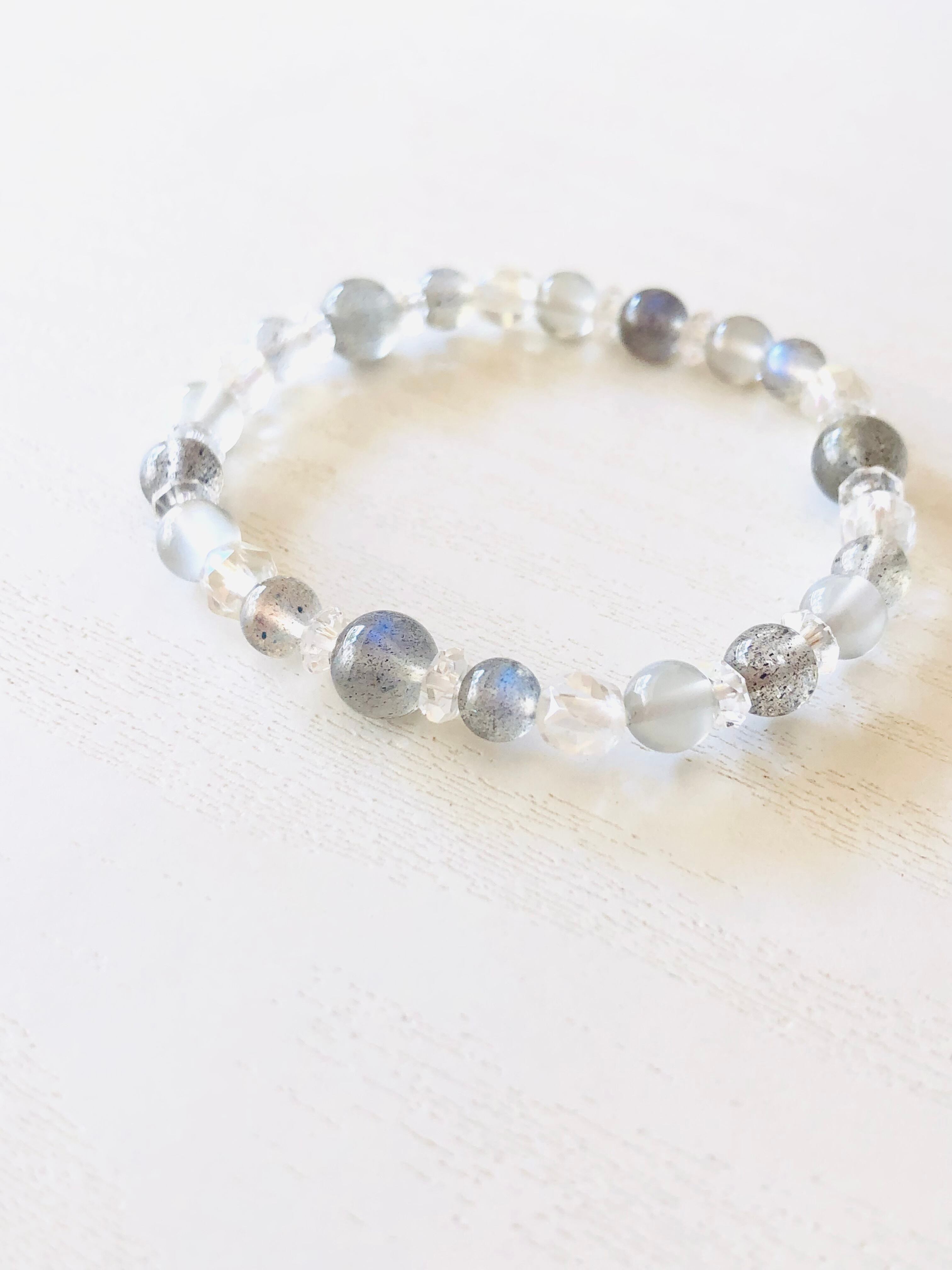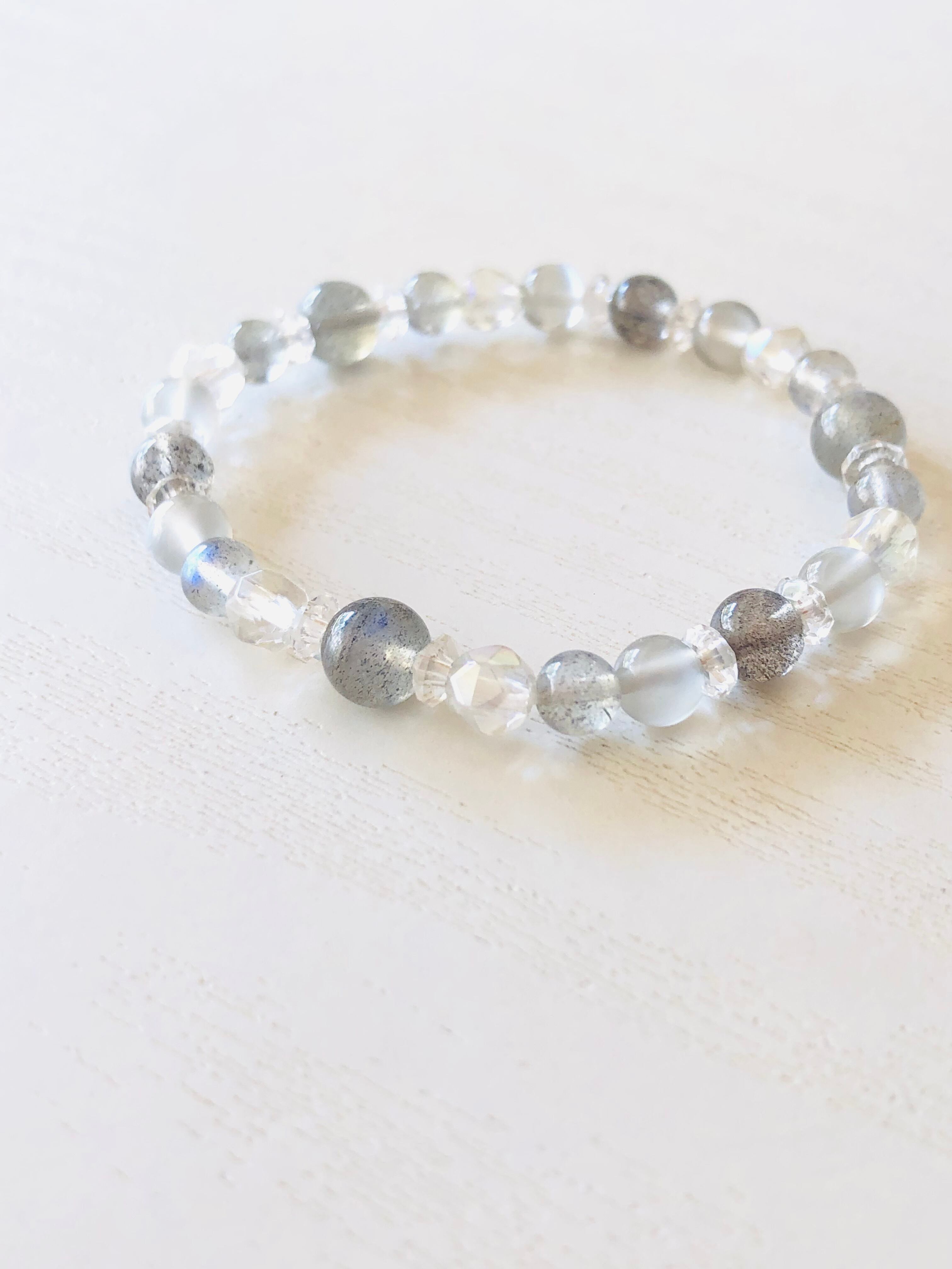 ラブラドライトのシラーの美しさを活かしながら、グレームーンストーンや水晶を合わせて、透明感のある雰囲気に仕上げています。