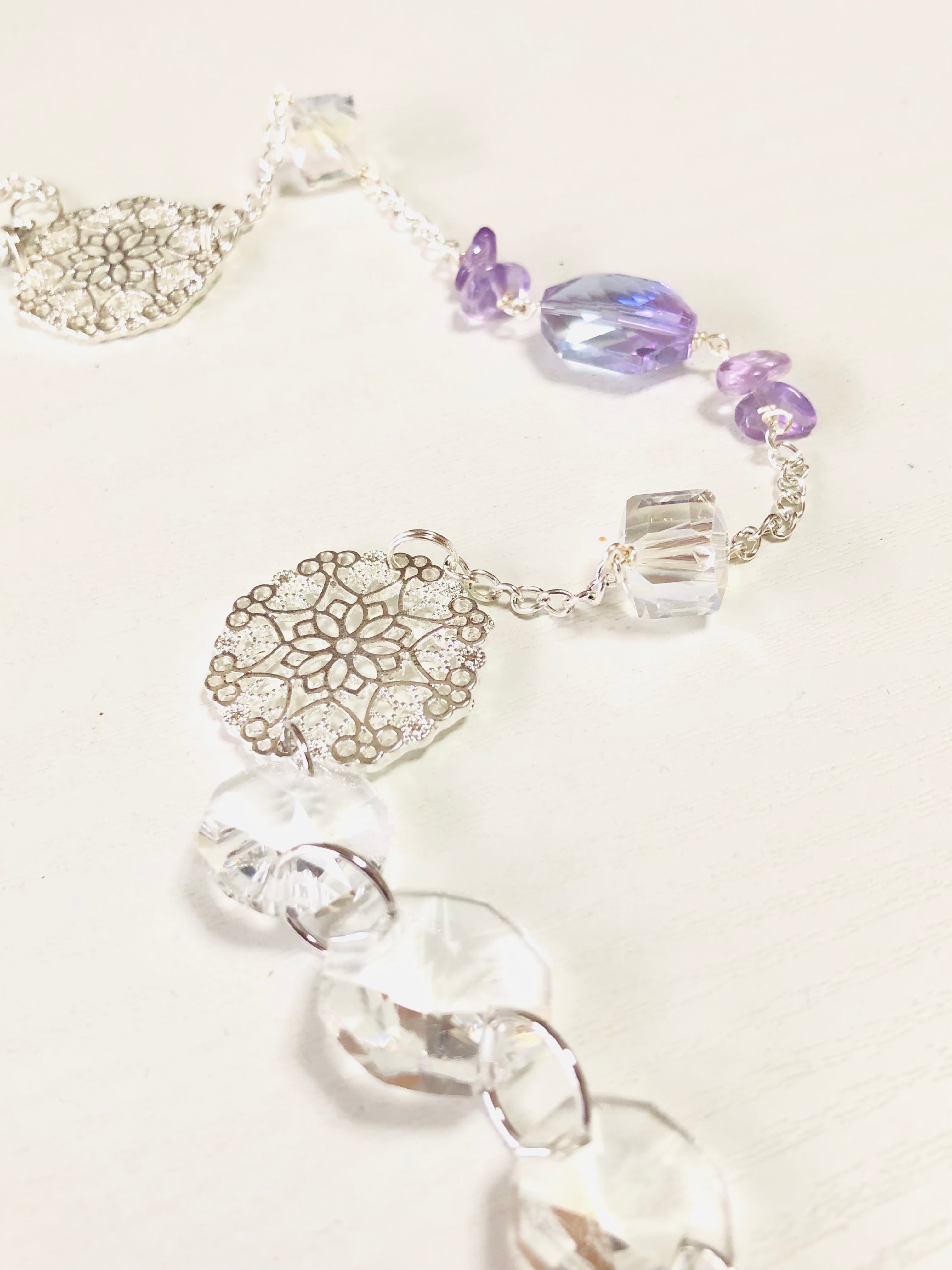 優しいラベンダーカラーの雫とアメジストのさざれ石を入れてシンプルに繋ぎました。